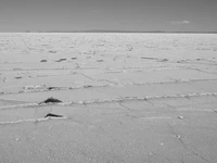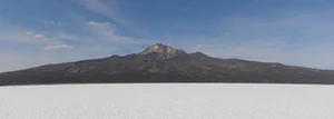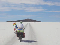 Le lendemain, quatrième jour de piste, notre dernière étape vers le Salar de Uyuni nous attend. Le ton est tout de suite donné : la piste se dégrade. Finie la nouvelle piste, place aux bons gros cailloux qui tapent dans les roues et arrêtent le vélo, au sable bien profond, vous savez, comme à la plage. En plus de ça, le vent se lève. Du bonheur ! Mais le paysage est magnifique, toute la journée nous contournons le splendide volcan Thunupa, majestueux, nous rencontrons de nombreux lamas, et enfin, en début d’après-midi, le Salar est en vue. Il s’agit du plus grand lac asséché de sel du monde. C’est assez émouvant de le voir enfin, ce mythe pour de nombreux cyclo-touristes en vadrouille en Amérique du Sud. Elle est assez surréaliste, cette grande tache blanche au milieu des volcans. De haut, on dirait comme un grand bout de banquise qui se serait perdu là… Après avoir fait le plein en eau (pas d’approvisionnement possible sur le Salar), enfin nos roues se posent sur la croûte de sel !!