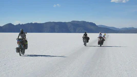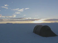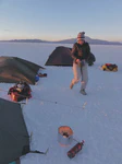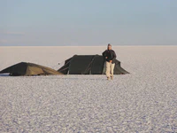 Et là ! Désenchantement : nous imaginions que rouler sur le Salar serait doux, agréable et facile. Il n’en est rien, car la surface est composée de nombreuses plaques de sel, qui rendent la progression très chaotique. Mais le spectacle est superbe, du blanc à droite, à gauche, devant, derrière, à perte de vue, c’est étourdissant. Durant nos premiers kilomètres, aucun d’entre nous ne parle : nous nous enivrons du paysage. Pour profiter encore plus de cette chance que nous avons, nous décidons de dormir en plein milieu du Salar. Le vent se lève fort, mais qu’importe, nous avons de bonnes tentes et un caillou pour réussir à planter les sardines dans la croûte de sel vraiment très solide. Au crépuscule, l’ambiance est magique : le soleil enflamme le ciel, le vide se fait tout autour de nous, le vent nous glace, et le sel, poussé par le vent, émet un bruit de carillon qu’on croirait sorti de nos imaginations. Dormir au milieu de tout ça est une expérience inoubliable.