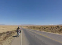 Les jours qui ont suivi, nous avons taché de bien profiter de nos derniers kilomètres de goudron. Nous avons avalé 350 kilomètres en trois jours : La Paz – Oruro – Challapata. Ça y est, nous étions lancés ! Comme l’entrée dans La Paz, la sortie a été longue et éprouvante. Nous avons largement eu le temps de nous énerver contre la très grande quantité d’abrutis qui a failli nous percuter. Là pour le coup, nous avons trouvé ça dangereux et nous avons eu peur plusieurs fois. Mais une fois sortis, à nous les grandes lignes droites… longues et ennuyeuses. 350 kilomètres sur l’Altiplano, c’est un peu long ; les lignes droites de 35 kilomètres, ce n’est pas très intéressant. Mais nous y avons tout de même fêté nos 10 000 kilomètres !!! Ça y est. Bon, il nous aura fallu le temps, mais nous n’en sommes pas peu fiers de ce nombre ! La Bolivie nous aura offert sur ce tronçon quelques petits moments sympathiques comme : dormir dans une salle de squash, assister au tournage d’un clip bolivien (non, on précise, mais ça change tout. Bolivien inclut kitch), rencontrer un chien avec des rastas ou encore assister au défilé d’enfants tous en costume au milieu de la campagne. Ça commençait fort !!!