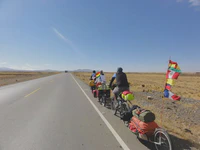 Après le village de Huari arriva enfin le moment un peu redouté par Marie : l’adieu à l’asphalte et l’entrée sur la piste pour plus de 400 looOOOoongs kilomètres. Parce qu’on se marre bien sur les photos, mais quitter un bon revêtement pour s’engager dans trois semaines de piste, faut quand même se motiver ! Dès le début, nous sommes catapultés directement dans un univers très plat, sableux et désertique. Le premier après-midi est magnifique et très impressionnant : avant même le déjeuner, nous voyions loin, très loin au fond de la morne plaine qui s’étale devant nous l’objectif du jour. Le village perché de Quillacas. Nous croisons des lamas, et plus étonnant, des gens, alors qu’il nous semble bien qu’il n’y ai pas grand-chose à des kilomètres à la ronde. Deuxième jour de piste, une bonne surprise nous attend. Nous naviguons guidés par un très bon topo rédigé par d’autres cyclistes passés quelques années avant nous[^3], la piste était prévue comme très mauvaise. En fait, depuis leur passage, celle-ci a commencé a être refaite et elle est bien roulable tout du long.