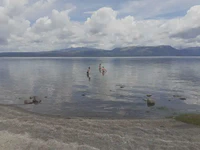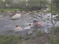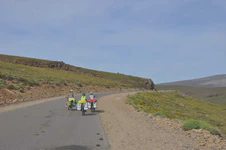 Autant la piste est très mauvaise, autant les paysages sont magnifiques. Après un petit bivouac tranquille au bord d’une rivière (les enfants étaient ravis de se baigner), nous continuons de grimper dans la bonne humeur vers un plateau. Cela se fait malheureusement sous un orage et une pluie battante pendant deux heures, dans un milieu complètement ouvert où nous sommes totalement exposés aux éléments. Bon, au moins on aura pris une bonne douche ! La pluie arrêtée, nous finissons la traversée de ce vaste plateau recouvert de roches et cendres volcaniques et passons au pied d’un volcan rouge étonnant. Puis nous entamons une descente vraiment sympa sur la piste qui est maintenant composée de cendres volcaniques très claires, tassées en talus sur les bords de chaque côté un peu comme la neige au bord des routes en hiver. En passant dessus en vélo, cela produit un léger bruit de frottements comme des skis sur la neige. Tout nous donne vraiment l’impression d’être sur une piste de ski !