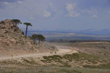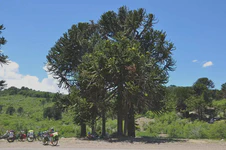 Au deuxième jour, les choses se corsent un peu avec la fin de l’asphalte au niveau du hameau du Primeros Pinos. Ici, les hivers doivent être rudes au vu des photos des chalets enneigés affichées dans la petite tienda où nous achetons quelques paquets de gâteaux pour compléter le ravitaillement. Internet est encore disponible jusque dans des coins reculés comme ici, cela nous permet de passer un petit coup de fil à notre amie Sophie, médecin généraliste et experte en médecine de brousse, pour faire une petite vérification sur un potentiel petit pépin de santé pour Alicia. C’est super confortable de pouvoir lever des petits doutes et d’avancer plus serein grâce à ses conseils… Merci Sophie ! A Primeros Pinos apparaissent les premiers pins Araucaria. Ces arbres massifs et extrêmement vieux, symboles de la région, produisent des pignons longs de plusieurs centimètres, délicieux, que l’on peut consommer bouillis ou cuits au barbecue. On les appelle Désespoir des singes en France à cause de leurs épines épaisses, rigides, piquantes et très resserrées.