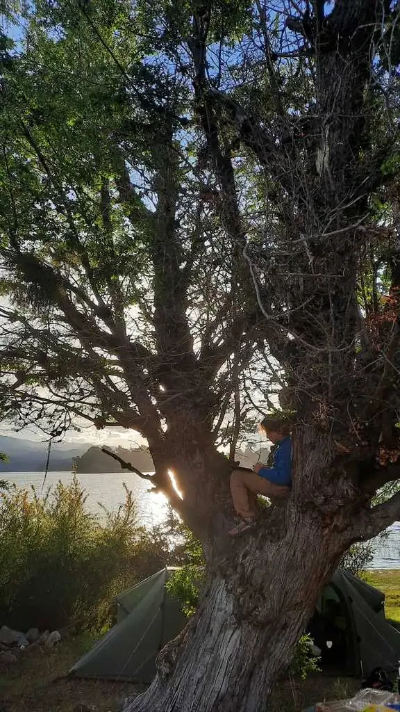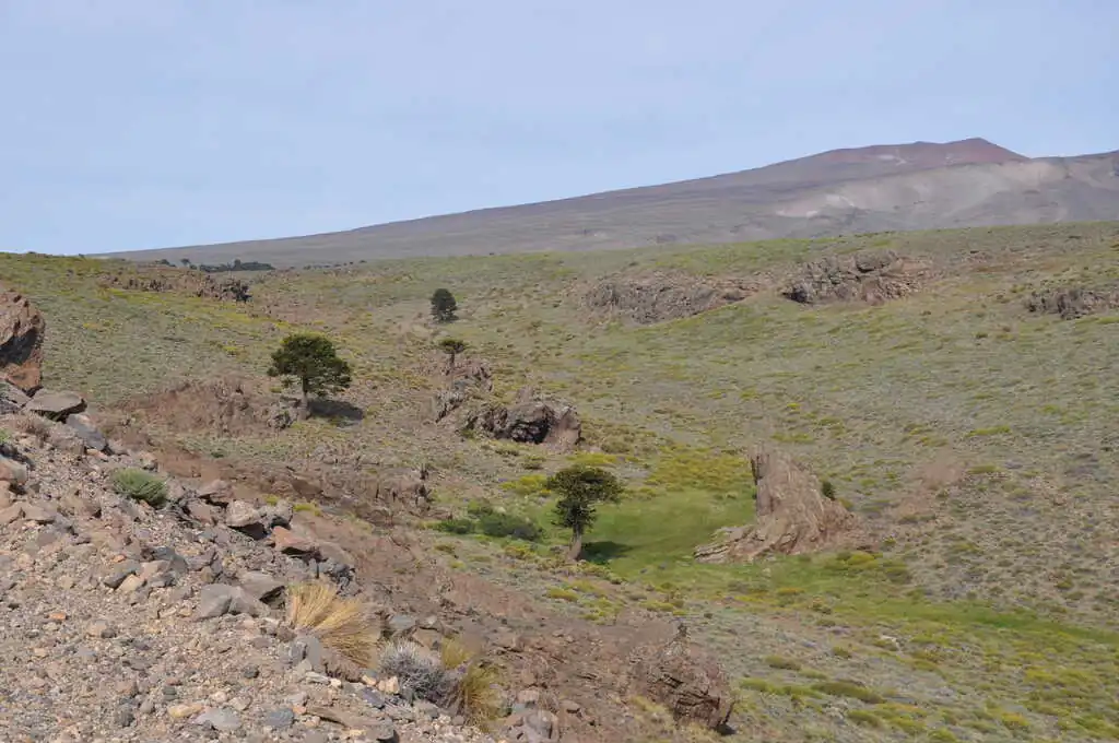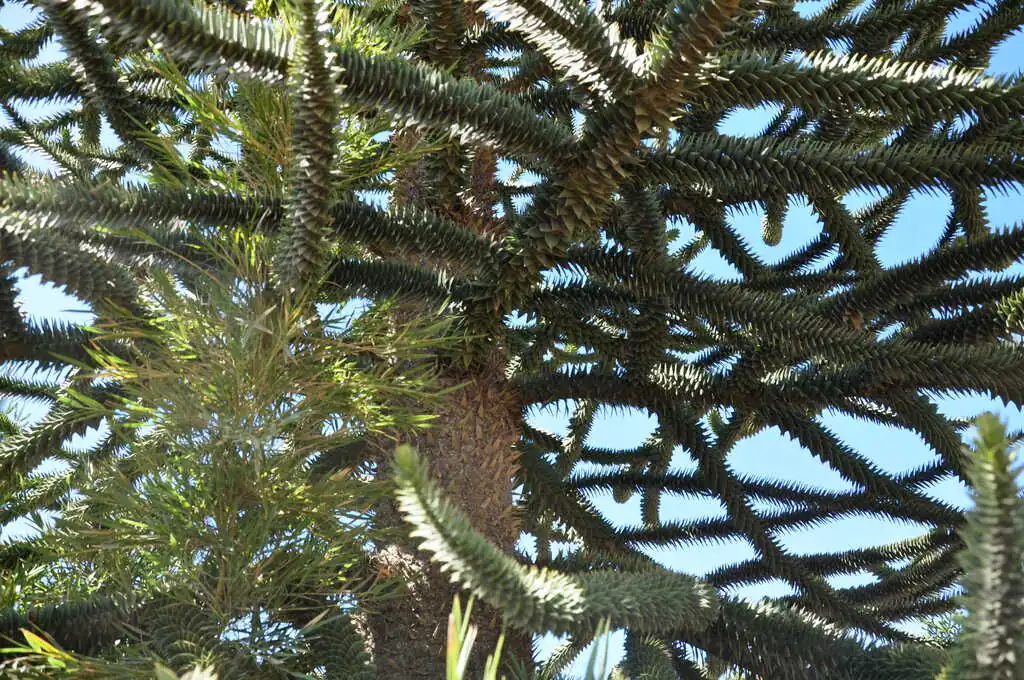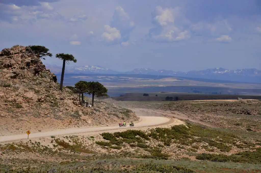 Au deuxième jour, les choses se corsent un peu avec la fin de l’asphalte au niveau du hameau du Primeros Pinos. Ici, les hivers doivent être rudes au vu des photos des chalets enneigés affichées dans la petite tienda où nous achetons quelques paquets de gâteaux pour compléter le ravitaillement. Internet est encore disponible jusque dans des coins reculés comme ici, cela nous permet de passer un petit coup de fil à notre amie Sophie, médecin généraliste et experte en médecine de brousse, pour faire une petite vérification sur un potentiel petit pépin de santé pour Alicia. C’est super confortable de pouvoir lever des petits doutes et d’avancer plus serein grâce à ses conseils… Merci Sophie ! A Primeros Pinos apparaissent les premiers pins Araucaria. Ces arbres massifs et extrêmement vieux, symboles de la région, produisent des pignons longs de plusieurs centimètres, délicieux, que l’on peut consommer bouillis ou cuits au barbecue. On les appelle Désespoir des singes en France à cause de leurs épines épaisses, rigides, piquantes et très resserrées.