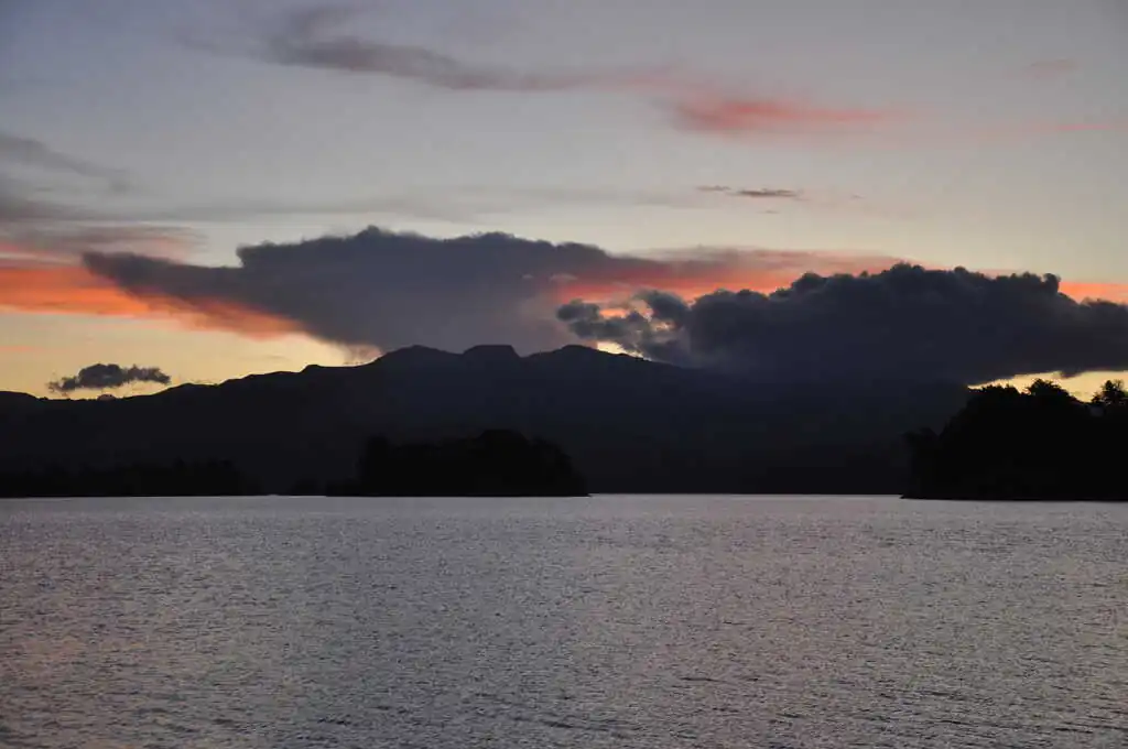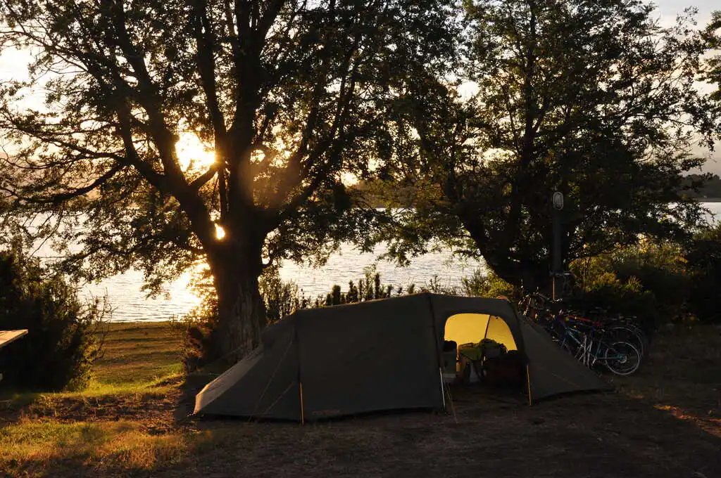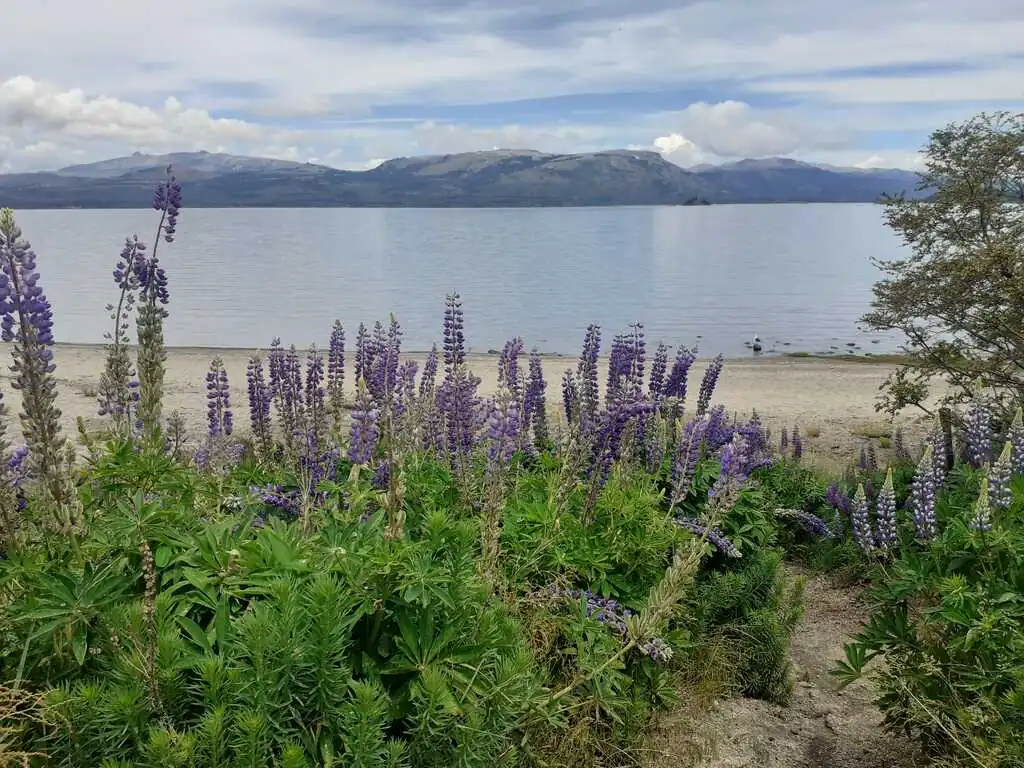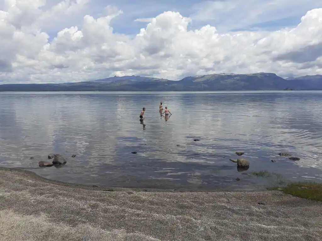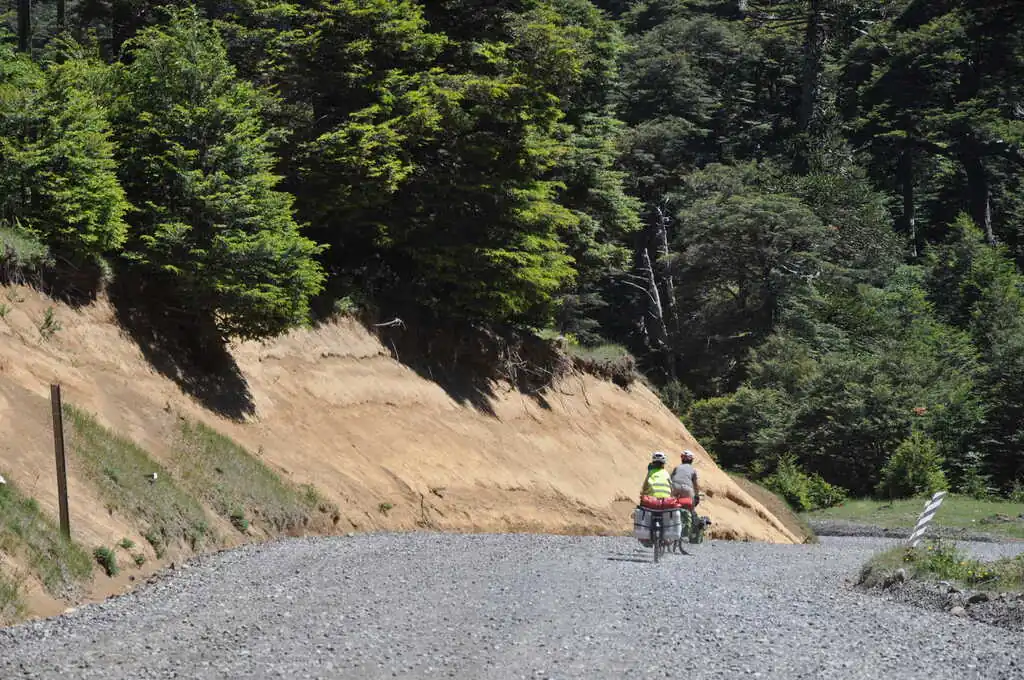 C’est dans cette descente que LE changement opère : en quelques kilomètres, nous quittons définitivement les paysages secs et semi-désertiques et plongeons avec délice vers des paysages de forêts ! L’apothéose est atteinte lorsqu’au détour d’un virage, le lac Icalma apparaît, magnifique, déroulant une superbe plage déserte. Ni une, ni deux, les vélos sont posés sur le bas-côté, nous enfilons les maillots de bain et sautons à l’eau ! Nous poursuivons le lendemain en montée jusqu’au poste frontière argentin, puis entrons au Chili par la toute petite frontière d’Icalma. Dès les premiers kilomètres, on retrouve la piste (que nous avions quitté au lac Icalma) et cette manie chilienne : ils ne connaissent pas les lacets ! Les pentes sont raides en montée comme en descente. Mais les paysages sont tellement beaux !! Nous naviguons entre de belles montagnes arrondies, des volcans et des lacs. Notre premier bivouac chilien est parfait : au bord d’un lac, sur de l’herbe bien grasse et humide, de l’eau douce à portée de main, des arbres partout où porte le regard. Nous profitons tous de cette soirée paisible des étoiles plein les yeux.
