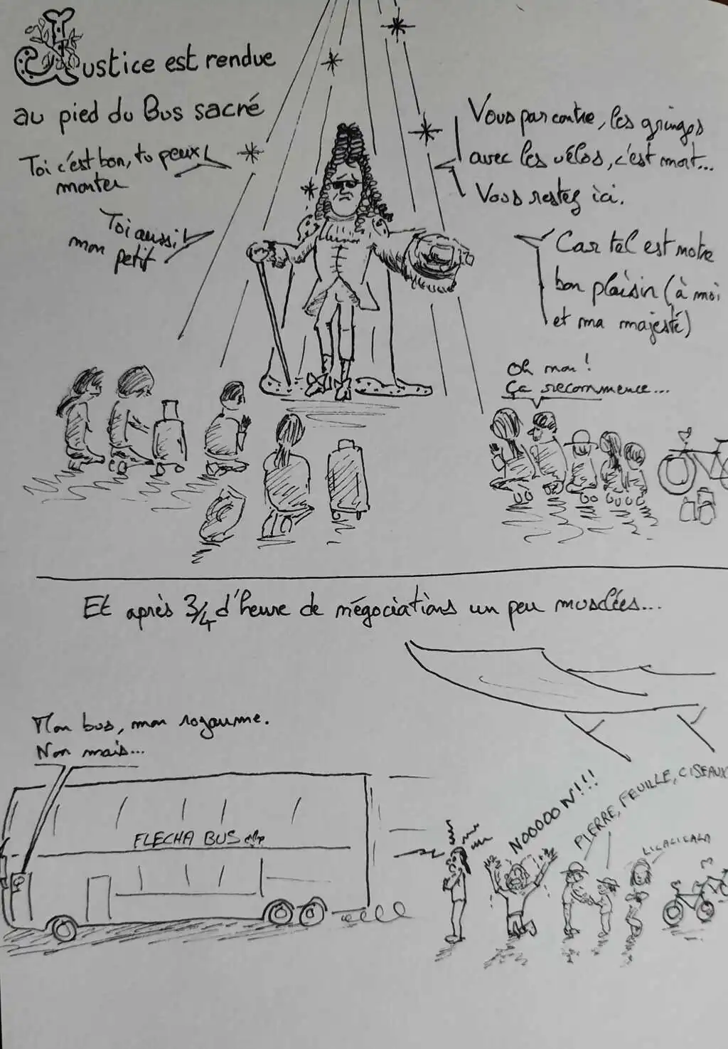 En arrivant à Salta, la première chose que nous faisons donc est de nous rendre au terminal de bus afin d’anticiper autant que faire se peut les problèmes liés au transport de vélos dans les bus argentins. Après quelques demandes infructueuses auprès de diverses compagnies (qui nous refusent toutes les vélos et nous demandent de les envoyer à part en colis), la chance semble nous sourire avec FlechaBus. Camila, au guichet, prend le temps d’écouter la description exacte de tout notre barda et nous assure que, si si, il sera tout à fait possible de voyager avec nos vélos. Nous sommes un peu surpris (au regard de notre propre expérience et de celle d’autres cyclos), mais demandons de façon très claire, montrons des photos, et insistons lourdement pour être sûrs que Camila ait bien compris le volume avec lequel nous voyageons. Pour optimiser nos chances de réussir à monter dans le bus, nous achetons les billets et l’excédent bagage pour le 1ᵉʳ décembre, dans six jours. C’est un lundi, normalement le jour où les bus sont les moins pleins : mettons toutes les chances de notre côté !