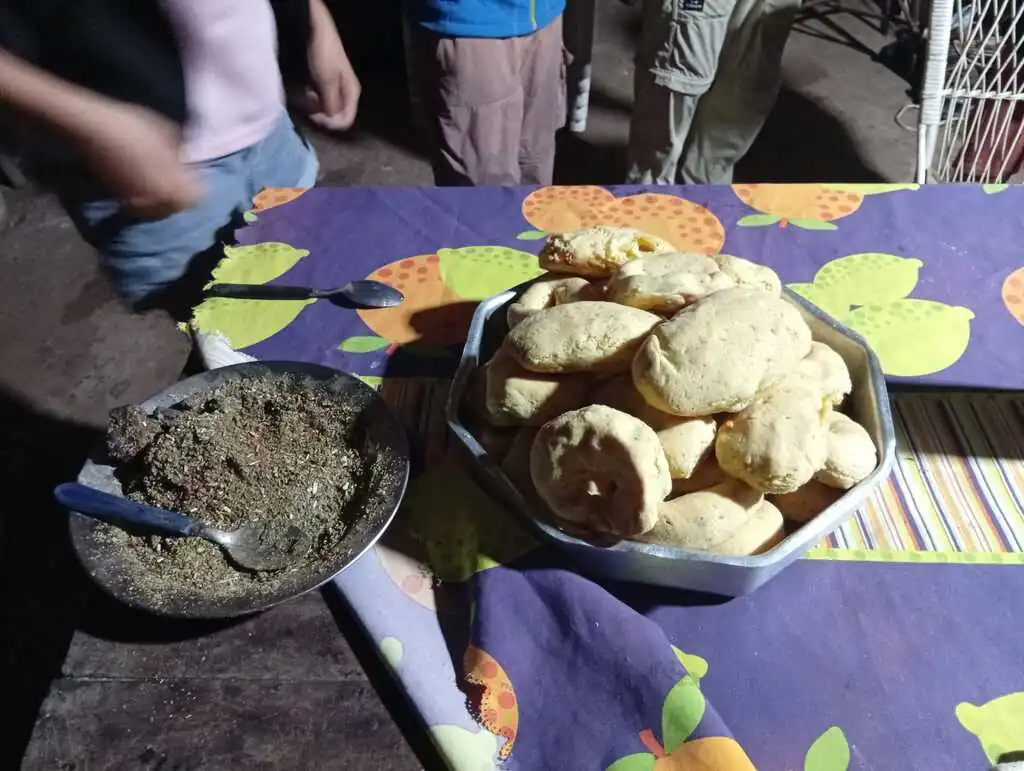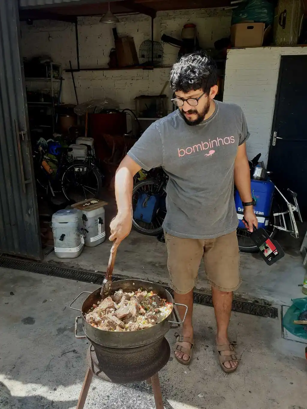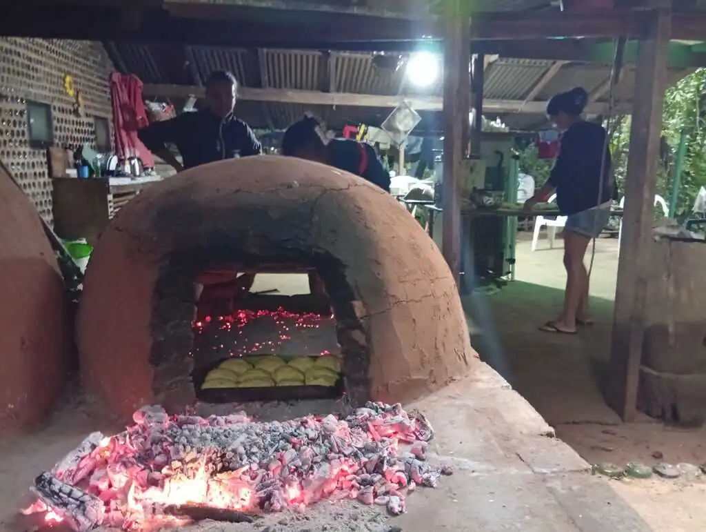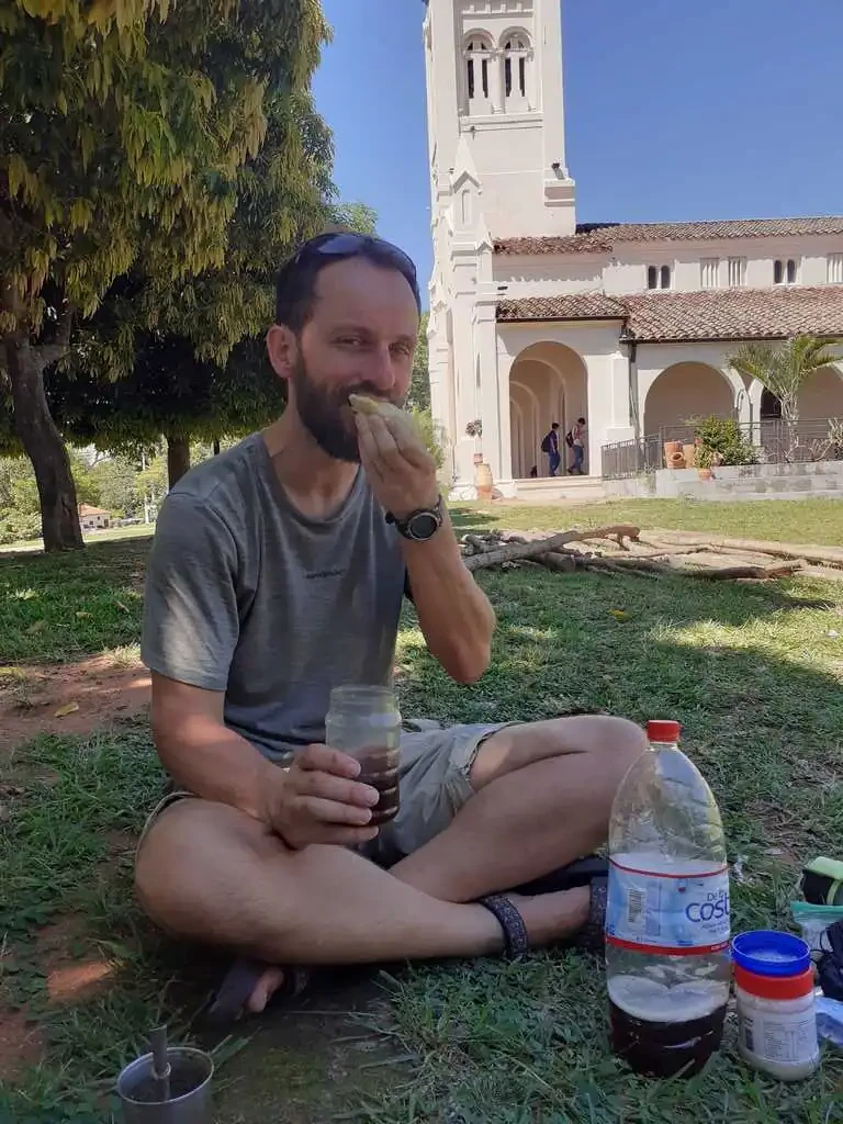 Au deuxième jour de ce séjour, alors que nous rentrons nous baigner dans un petit arroyo (petite rivière), la famille propriétaire du terrain nous invite très spontanément à revenir le lendemain pour confectionner des chipas con cocido avec eux. Ca ne se refuse pas ! Nous voilà donc le lendemain installés dans leur immense “cuisine” en extérieur, un toit, un mur en terre et en bouteilles de verre, au beau milieu d’un jardin tropical. On lance d’abord la chauffe du four à bois, construit en terre et en brique. Puis nous apprenons la recette et les gestes pour fabriquer les chipas, véritable marque de fabrique de la cuisine paraguayenne. Il s’agit de petits pains à base de farine de manioc et de fromage maison, très similaires aux paos de queijo brésiliens pour les connaisseurs. Il y en a de plusieurs sortes : chipas classiques, chipas au fromage (avec du fromage frais dedans qui fond pendant la cuisons), chipas m’boca (cuites à la broche), chipa so’o (fourrées à la viande), etc. Nous les mettons ensuite à cuire dans le four à bois bien chaud. Et nous préparons le fameux cocido ! Cette boisson est, selon les paraguayens, LA boisson qui accompagne la dégustation des chipas ! Au Paraguay, le téréré est la boisson nationale, c’est très similaire au maté plus connu, mais avec de l’eau glacée. Pour le cocido, même base : l’herbe à maté. On dispose de l’herbe et du sucre dans un grand plat, que l’on mélange avec des charbons ardents sortis du four à chipas. Résultat : l’herbe cuit et le sucre caramélise. On verse le tout dans de l’eau chaude (charbons compris), on filtre et c’est prêt ! Et c’est délicieux ! C’était un super moment avec cette famille super gentille. Et ce qui est super dans le fait de pouvoir cuisiner des plats typiques, c’est de comprendre plein de petits détails culturels : pourquoi cette forme ronde pour les chipas ? Pour pouvoir les sortir facilement du four chaud avec un petit crochet. Pourquoi le cocido avec les chipas ? Parce qu’on utilise les charbons qui ont cuits les-dites chipas ! Bref, c’était super intéressant et très chouette comme moment !