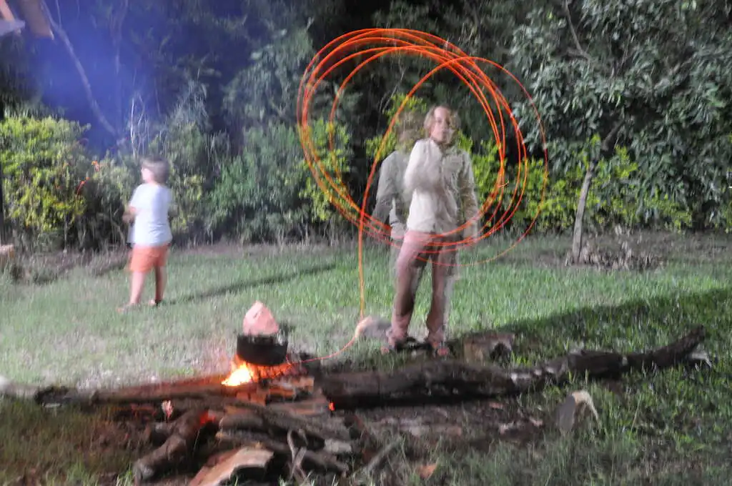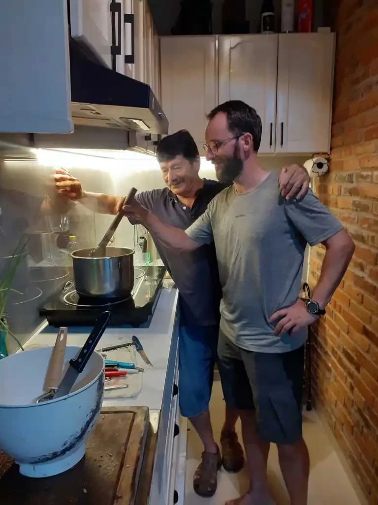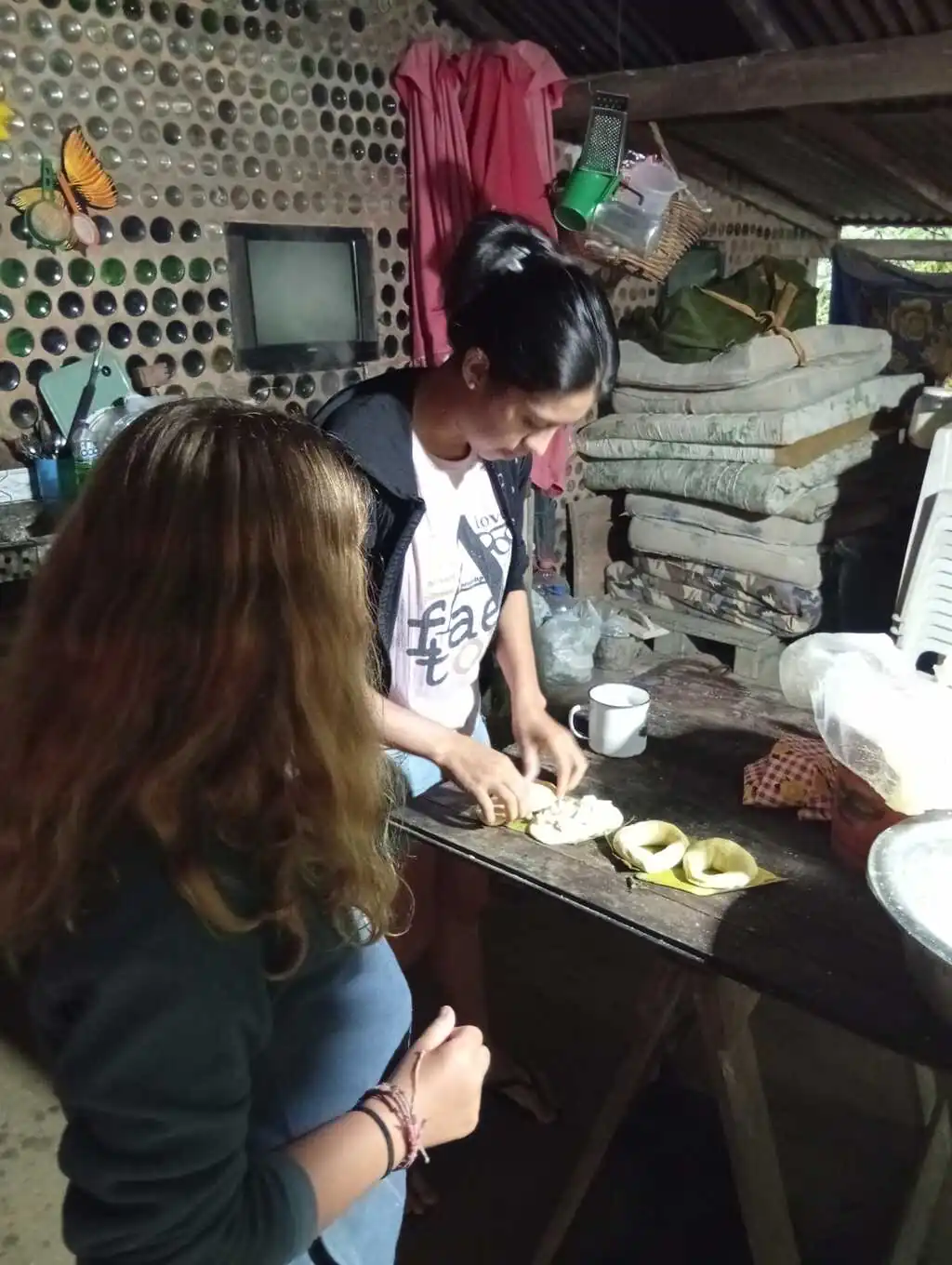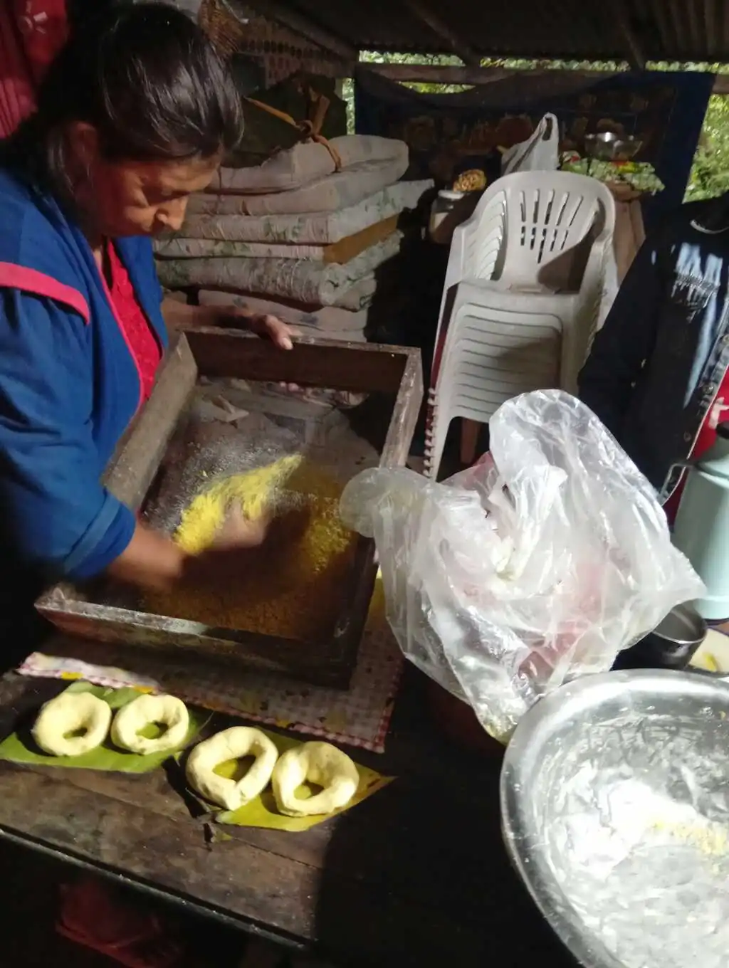 Au deuxième jour de ce séjour, alors que nous rentrons nous baigner dans un petit arroyo (petite rivière), la famille propriétaire du terrain nous invite très spontanément à revenir le lendemain pour confectionner des chipas con cocido avec eux. Ca ne se refuse pas ! Nous voilà donc le lendemain installés dans leur immense “cuisine” en extérieur, un toit, un mur en terre et en bouteilles de verre, au beau milieu d’un jardin tropical. On lance d’abord la chauffe du four à bois, construit en terre et en brique. Puis nous apprenons la recette et les gestes pour fabriquer les chipas, véritable marque de fabrique de la cuisine paraguayenne. Il s’agit de petits pains à base de farine de manioc et de fromage maison, très similaires aux paos de queijo brésiliens pour les connaisseurs. Il y en a de plusieurs sortes : chipas classiques, chipas au fromage (avec du fromage frais dedans qui fond pendant la cuisons), chipas m’boca (cuites à la broche), chipa so’o (fourrées à la viande), etc. Nous les mettons ensuite à cuire dans le four à bois bien chaud. Et nous préparons le fameux cocido ! Cette boisson est, selon les paraguayens, LA boisson qui accompagne la dégustation des chipas ! Au Paraguay, le téréré est la boisson nationale, c’est très similaire au maté plus connu, mais avec de l’eau glacée. Pour le cocido, même base : l’herbe à maté. On dispose de l’herbe et du sucre dans un grand plat, que l’on mélange avec des charbons ardents sortis du four à chipas. Résultat : l’herbe cuit et le sucre caramélise. On verse le tout dans de l’eau chaude (charbons compris), on filtre et c’est prêt ! Et c’est délicieux ! C’était un super moment avec cette famille super gentille. Et ce qui est super dans le fait de pouvoir cuisiner des plats typiques, c’est de comprendre plein de petits détails culturels : pourquoi cette forme ronde pour les chipas ? Pour pouvoir les sortir facilement du four chaud avec un petit crochet. Pourquoi le cocido avec les chipas ? Parce qu’on utilise les charbons qui ont cuits les-dites chipas ! Bref, c’était super intéressant et très chouette comme moment !
