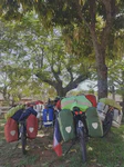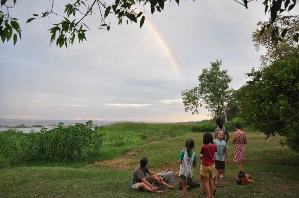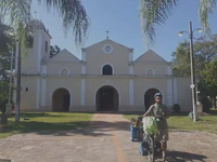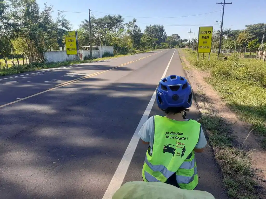 Première journée de vélo, on appréhende la chaleur ! Alors, on décolle à 8h en espérant faire un maximum de kilomètres le matin. Nous sortons progressivement de l’agglomération. Les sorties de ville ne sont jamais très agréables, mais là ça se fait plutôt bien en évitant les axes majeurs. Les conducteurs en tous genres (camions, voitures, motos, etc.) sont plutôt attentifs à notre caravane et la route est agréable. Et c’est plat par rapport à la Cordillère des Andes ! Notre première étape est Aregua, qui s’avère être une jolie petite ville. Nous y arrivons vers 11h30, et nous installons à l’ombre des manguiers derrière la cathédrale pour déjeuner, faire les leçons et surtout laisser passer la chaleur du milieu de journée. En milieu d’après-midi, nous quittons notre cachette pour commencer à chercher un endroit où passer la nuit. On tente notre chance d’abord chez les pompiers (ceux d’Amérique du Sud sont habitués à filer des coups de main aux voyageurs à vélo), mais il n’y a personne… En face, un édifice original attire notre attention : il s’agit d’une « bio-école », comme indiqué sur la pancarte à l’entrée. Et quelqu’un finit par arriver : la fondatrice du lieu ! Elle nous présente le lieu (avec la majorité des bâtiments en auto et éco-construction), qui est une fondation et propose des cours gratuits d’arts et de sports aux membres de la communauté locale. Le projet est super intéressant !! Et en deux temps, trois mouvements, on se retrouve invités à dormir sur le site pour la nuit ! Puis à passer la soirée en compagnie de Sévé (“évadée” de Suisse), de Javo et de leurs trois enfants, une sacrée famille ! Puis ils nous convient chez eux le lendemain ! Et ça tombe à pic car les enfants déclenchent tous les trois une otite, sûrement la faute à un peu trop de piscine à Nembly…