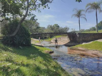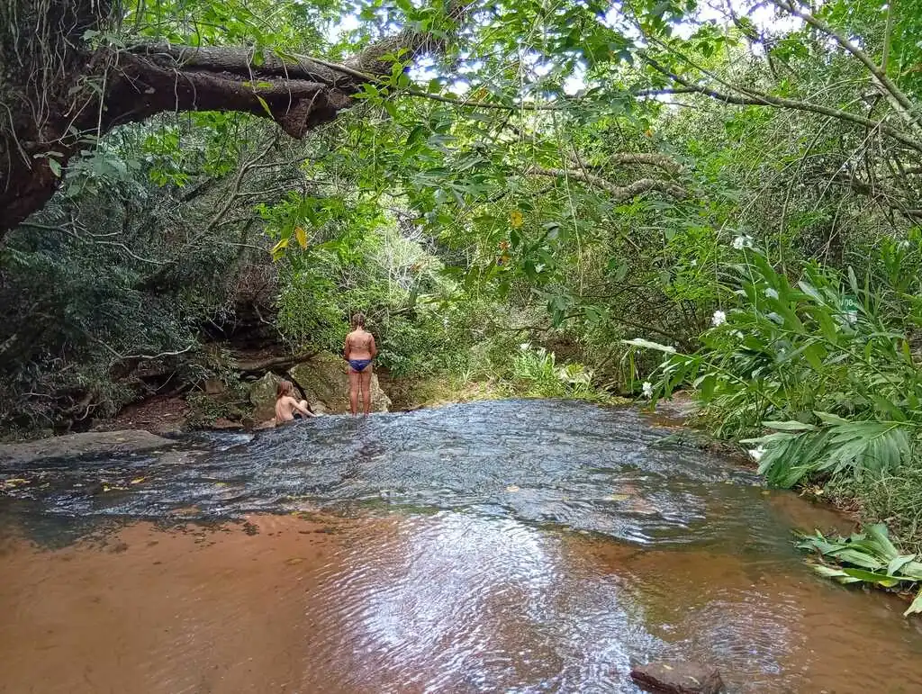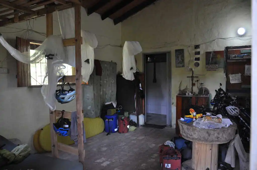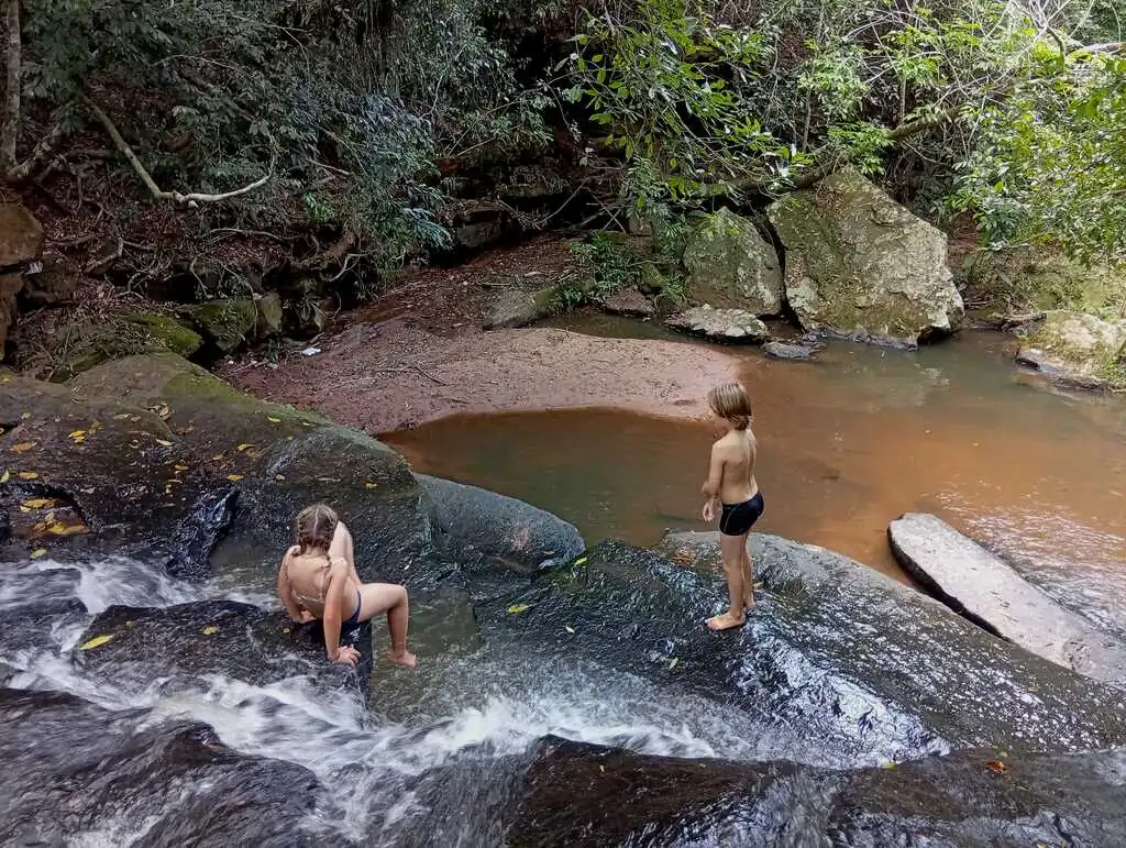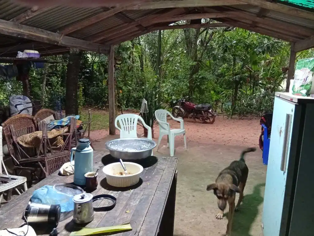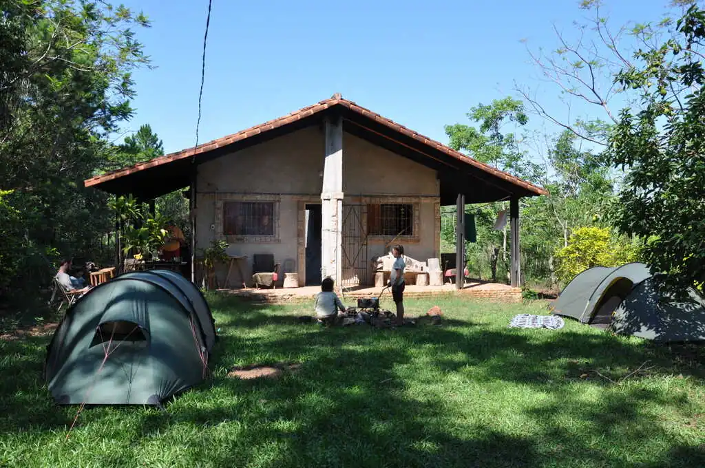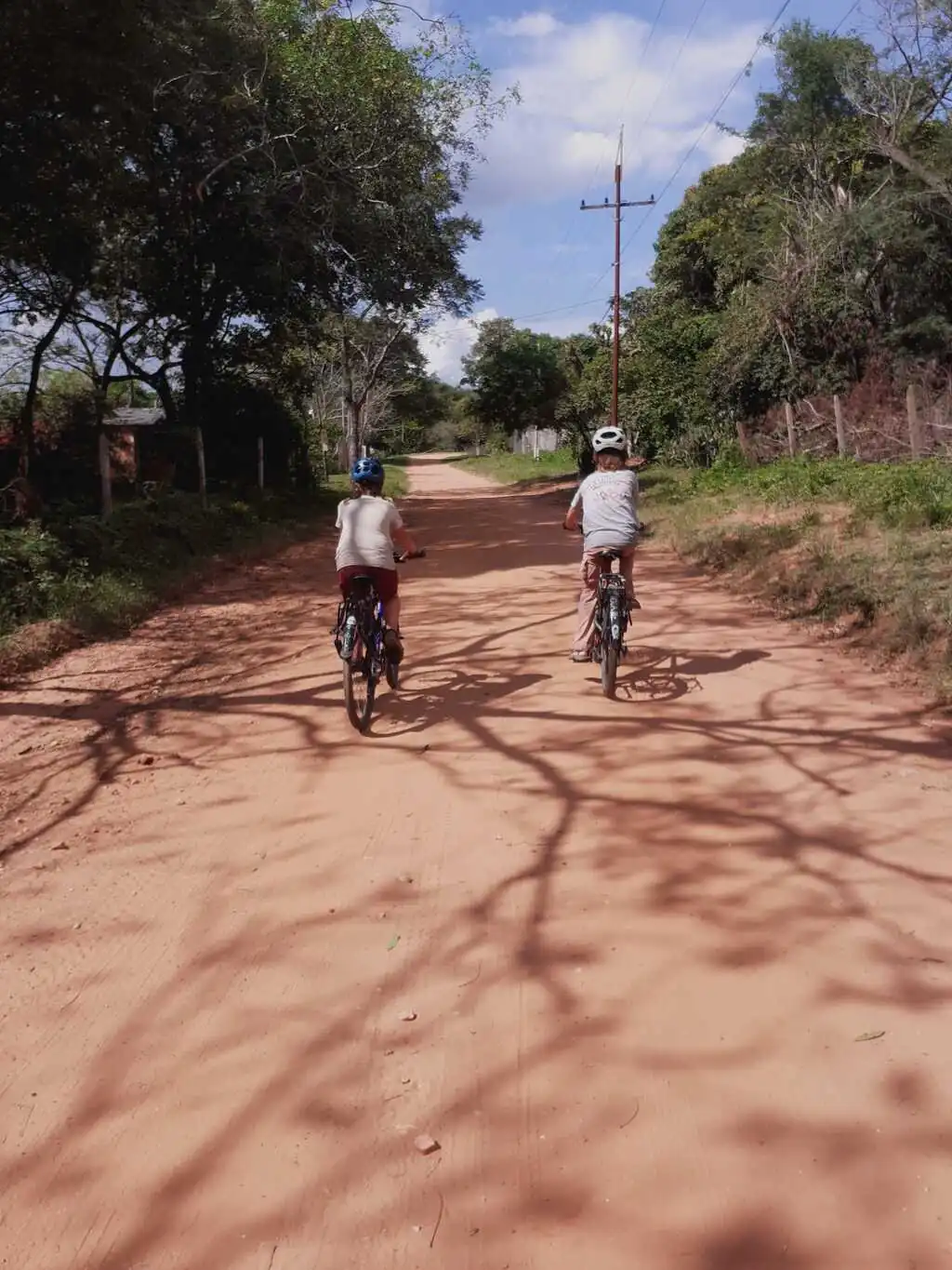Nous remontons donc finalement sur nos vélos en direction de Chololo pour finir une journée à 45 kilomètres au lieu des 27 prévu ! C’est la première fois que nous pédalons au Paraguay l’après-midi, par 37 degrés de température. Heureusement que nos enfants ont de la ressource… La montée pour y accéder se fait sous une chaleur terrible, on sue comme rarement, malgré l’ombre qui nous protège du soleil au bout de quelques kilomètres (mais la température est mesurée à l’ombre donc ça reste 37 degrés quand-même). Mais ça en vaut la peine ! Nous passons la soirée à papoter avec Nibely, puis Estela sa femme, qui se joint à nous le lendemain. Ils nous laissent finalement les clefs de la maison, tout en ayant pris soin de nous indiquer les petites rivières où nous baigner aux alentours. Incroyable cette rencontre ! Ça fait chaud au cœur ! Nous voici donc pour trois jours à Chololo, à profiter des collines environnantes et des ruisseaux. Quatre murs, un toit, l’eau potable courante et l’électricité, cette maison est modeste mais c’est tout confort !