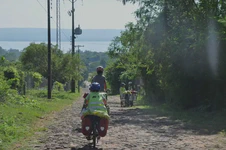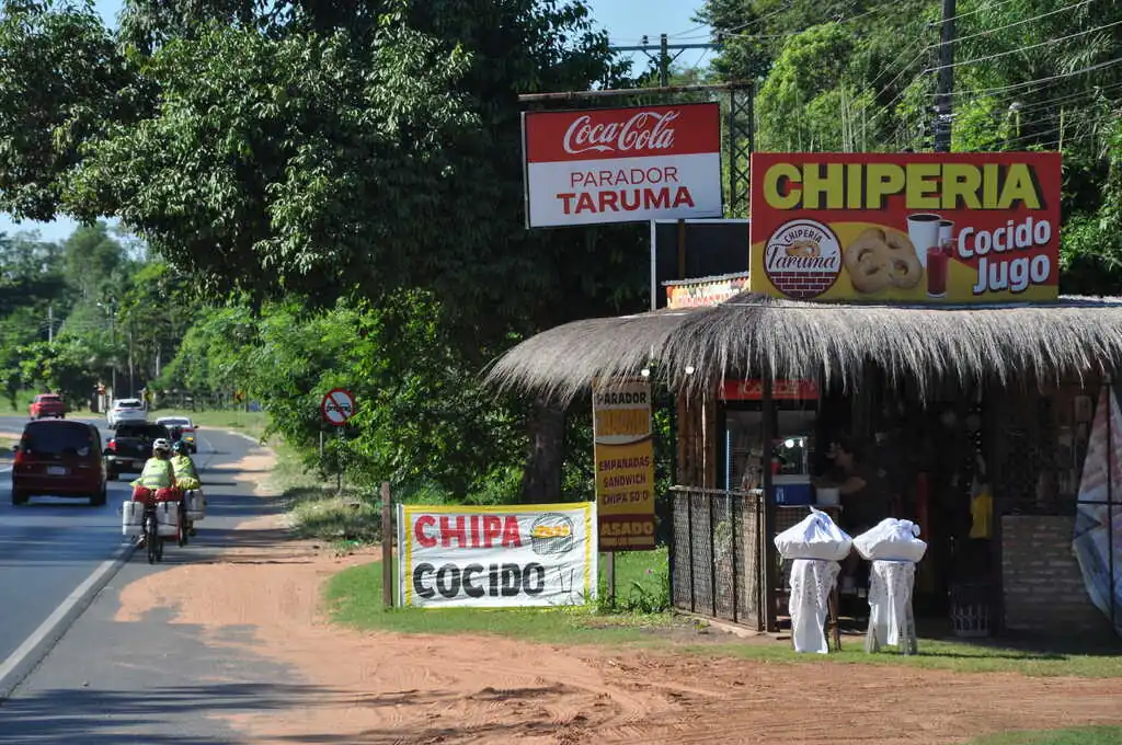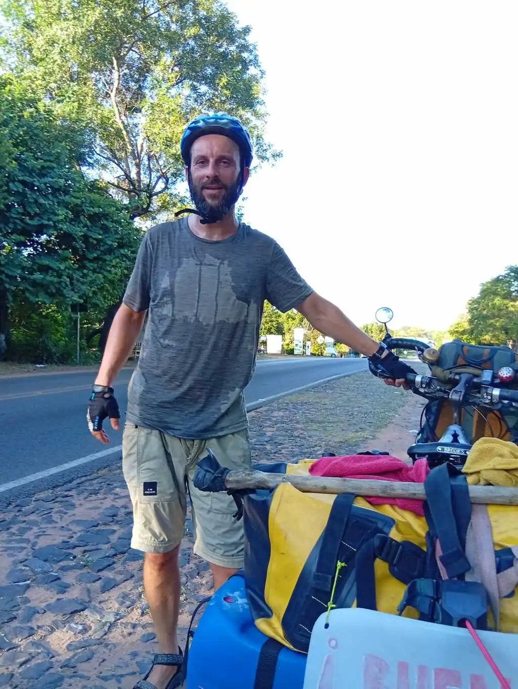 Nous avons visé une toute petite frontière. Après avoir passé l’office de migration côté argentin, c’est un petit bac qui nous attend pour traverser le fleuve Paraguay qui marque la frontière entre le pays éponyme et l’Argentine. Sur l’eau, le soleil tape fort, il y a peu d’air. Après y avoir débarqué, l’entrée au Paraguay se passe sans encombre. Les premières personnes à qui nous avons à faire sont souriantes et très aimables. Tout le monde nous souhaite la bienvenue avec un enthousiasme sincère. Ça change de certaines frontières où les gens tirent un peu la tronche ! Entre le port et notre point de chute, il nous faut pédaler en ville encore une quinzaine de kilomètres, et là c’est dur, la chaleur nous écrase et nous transpirons à grosses gouttes. Dans le premier quartier traversé, nos repères sont bousculés. Tout en restant attentifs, il nous faut étouffer cette petite voix d’européens privilégiés dans notre tête qui nous dit : « Hou là là, c’est pas fou ici, les trottoirs sont défoncés, les rues aussi, les maisons sont de bric et de broc, ça craint non ? ». Mais les gens sont tous souriants. Contrairement à certains endroits où nous avons pu passer précédemment et où les gens nous mettaient en garde, ici, tout le monde nous souhaite la bienvenue. Puis sans transition, nous entrons dans un quartier ultra-privilégié avec golf et yacht-club, et, ce qui nous frappe le plus, d’énormes villas… sans aucune clôture. Généralement, dans les autres pays d’Amérique du Sud que nous connaissons, même les maisons modestes sont souvent entourées de hautes clôtures, si possible avec barbelés, verre pilé, et enfin barreaux à toutes les fenêtres. Ici, beaucoup de maisons n’ont pas de clôtures du tout et des barreaux seulement au rez-de-chaussée. C’est plutôt rassurant.