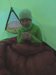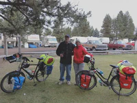 Comme on nous l’avait promis, ici on saute directement de l’été à l’hiver ! Alors qu’une semaine auparavant nous roulions en T-shirt et sandales, à Bend, il nous a fallu sortir gants, bonnets et autres vêtements d’hiver : il a gelé dès notre première nuit là-bas. Les vêtements que nous avions lavé et mis à sécher dehors pendant la nuit sont devenus rigides comme du carton ! Les vélos étaient recouverts du givre et nous avons dû petit-déjeuner dans les duvets… Il faisait 1°C dans la tente au réveil. C’est froid.