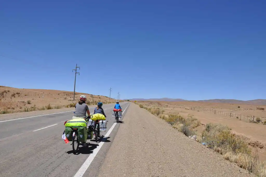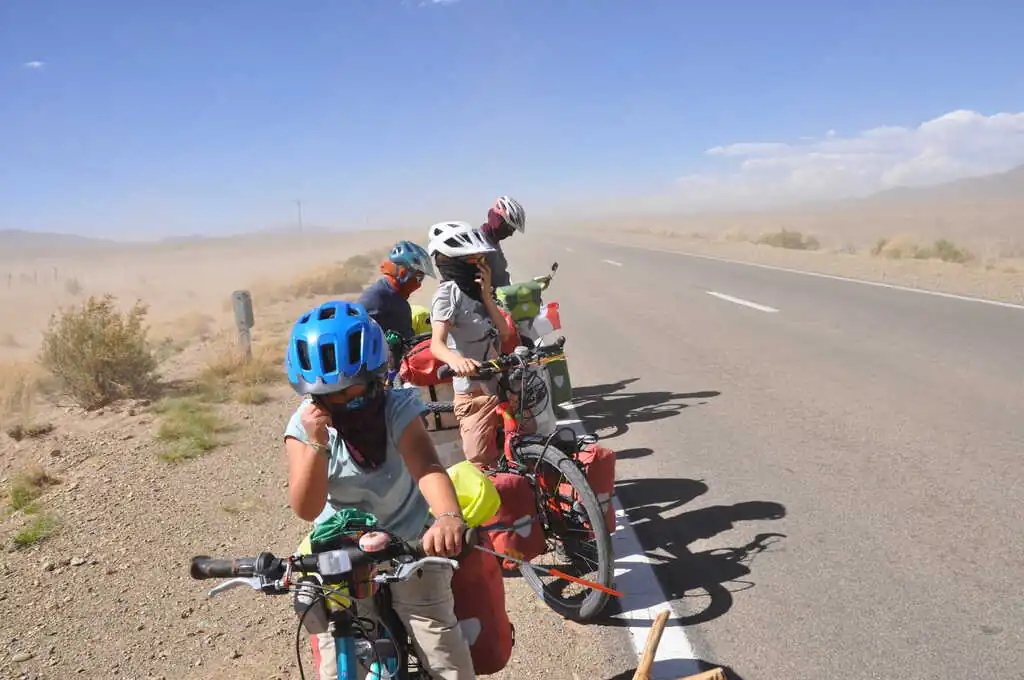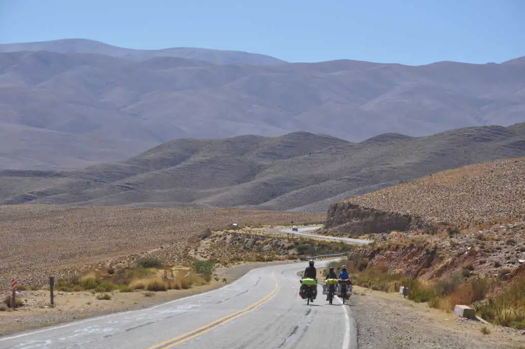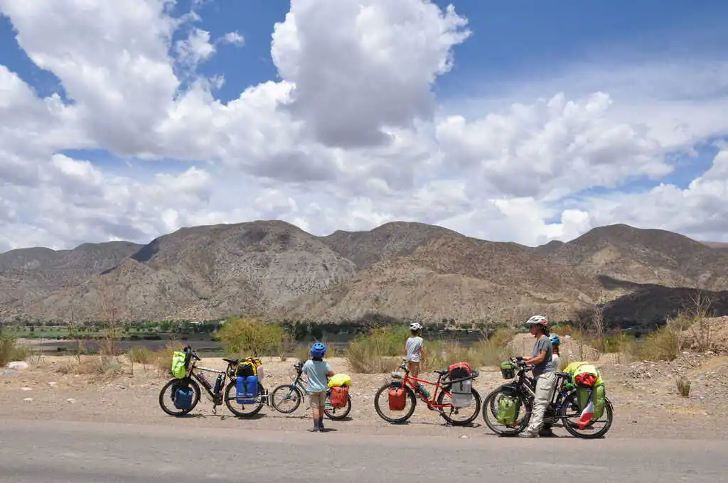 Au départ de La Quiaca, le lendemain, nous sommes de nouveau sur l’altiplano, en enchaîne les grandes lignes droites dans la pampa, le vent souffle fort et… contre nous. C’est beau mais c’est dur, il faut s’armer de patience. Heureusement, quelque chose nous motive, dont nous avons parlé aux enfants : dans quelques dizaines de kilomètres nous attend la descente de l’altiplano, 190 kilomètres pour passer de 3500 à 1300 mètres d’altitude (San Salvador de Jujuy). Nous espérons n’avoir qu’à nous laisser plus ou moins glisser jusqu’en bas. Pour cette première étape en Argentine, nous battons notre record de distance en une journée : 75 km, malgré le vent qui ne cessera de monter dans l’après-midi. Nous essuierons même une tempête de sable, gommage gratuit offert ! Les dents croustillent mais la peau est douce. Le lendemain, après une belle dernière montée, nous quittons définitivement l’altiplano et arrivons au dernier col avant la descente : Très Cruces. On jubile, on a hâte de profiter de ces kilomètres faciles !