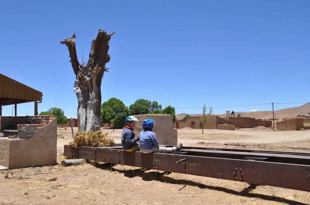 Premier soir après Très Cruces, après avoir essuyé un refus poli dans une école (“Le Directeur n’est pas là, je ne peux pas prendre la responsabilité de vous héberger.”), nous trouvons un joli petit coin de bivouac avec vue imprenable sur la petite vallée. Eau douce pas très loin, peu de vent, atmosphère très paisible, nuit étoilée, quel plaisir ! Bon, en termes gastronomiques, ce n’est toujours pas fou : on mange encore des pâtes vraiment mal cuites (la faute à l’altitude, mais aussi à la qualité du produit, pas au cuistot !). Au matin, comme depuis quelques jours, on essaye de partir entre 8h30 et 9h00. Le vent se levant au fur et à mesure de la journée, on essaye d’avancer au maximum le matin. Et on s’arrête pas trop tard le soir pour avoir le temps de profiter et de faire les leçons avec les enfants. La “descente” continue, on perd de l’altitude progressivement. Nous faisons étape à Huacalera pour la deuxième nuit dans cette vallée, dans un tout petit camping où nous sommes seuls, c’est royal.