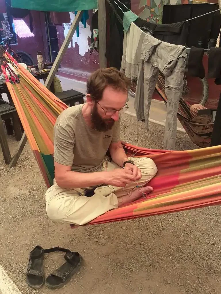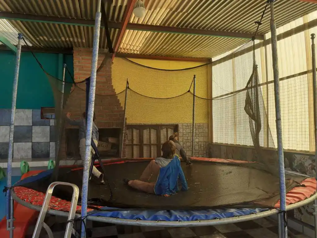 Après la traversée du désert de sel, l’entrée dans Uyuni n’a rien, vraiment rien d’une arrivée dans une oasis. Rues poussiéreuses, vent quotidien, pas de centre-ville un peu joli, point de départ d’excursions pour gringos donc prix pour gringos, bref, cette ville ne présente que peu d’intérêt… Heureusement, nous nous réfugions dans la casa de ciclista Puinguï de Myriam ! Et c’est bien ! Nous nous y installons pour quelques jours, enfin cinq jours pour être plus précis. Ici, rien de luxueux : une douche et un toilette pour tout le monde ; si affluence il y a, on partage bien sûr sa chambre avec des inconnus ; pas de lit mais des palettes sur lesquelles poser les matelas de bivouac. Mais l’ambiance y est chaleureuse ! Les chambres sont distribuées autour d’un patio central couvert, avec tables, bancs, hamacs, cuisine, chiens, chats et perroquet. Nous y partageons plusieurs repas avec tous les cyclistes qui arrivent chaque jour : argentins, polonais, tchèques, états-uniens, italiens (merci Claudio pour les bonbons et les gâteaux pour les enfants !), allemands, britanniques, etc. Il a fallu faire chauffer les cerveaux pour passer, parfois d’une phrase à l’autre de l’espagnol à l’anglais, puis au français pour revenir à l’espagnol.