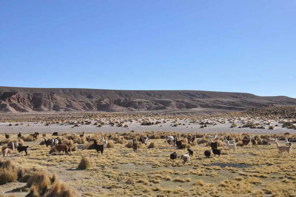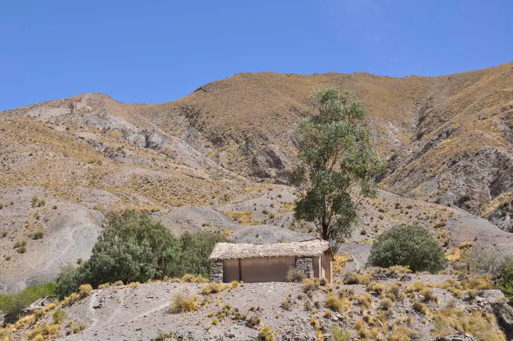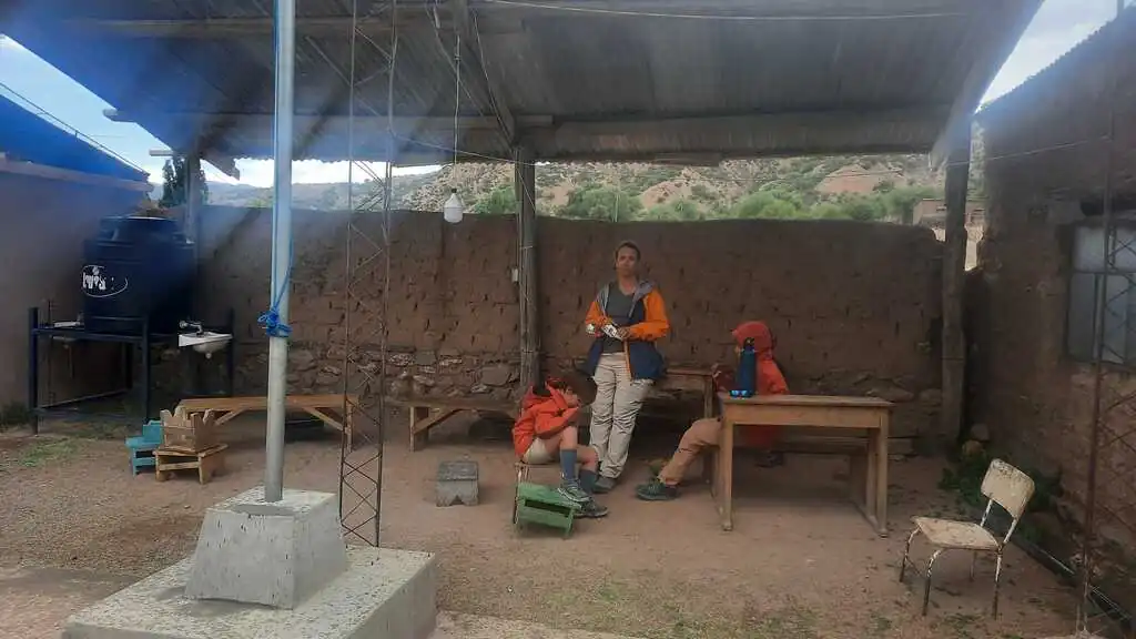 Nous quittons Tupiza en ayant conscience que nous partons pour un beau morceau de trajet sur les jours à venir. Quelques kilomètres de plat descendant après être sortis de cette ville, nous attaquons une belle montée, pas très longue mais avec une pente assez forte. Le temps est à l’orage. Nous nous abritons le temps du déjeuner dans la toute petite école (vingt élèves de trois à douze ans) de Saladillo afin de laisser passer la pluie et les éclairs. Puis, en fin de journée, nous trouvons un coin un peu à l’abri pour la nuit. Ce soir, ce sera sur le bord du terrain de foot du petit village de Yuruma. Malgré la pluie et le petit orage de nuit, nous sommes bien au calme. C’est même grand luxe car nous montons les tentes sur de l’herbe ! Ça change des cailloux et de la poussière. Les enfants observent avec plaisir un chat blessé à la patte venir s’installer dans l’abside de leur tente pendant l’orage. Nahuel lit dans les arbres, les filles jouent au mouton / cheval / lama et sa bergère, comme tous les jours en ce moment. Tout est calme.