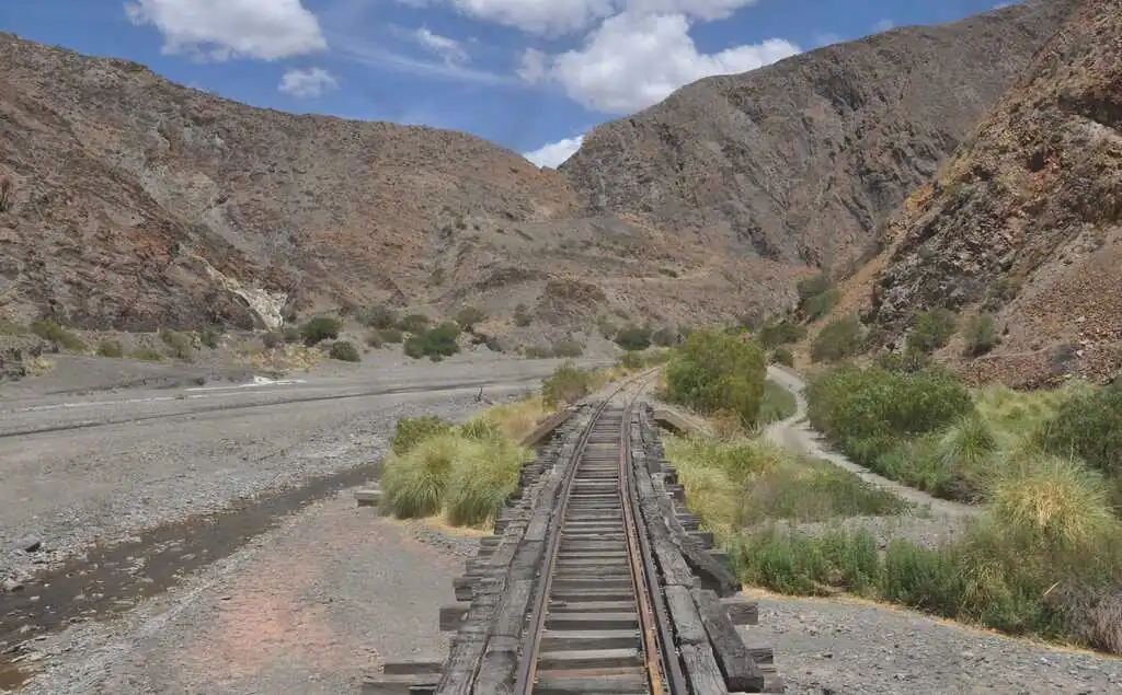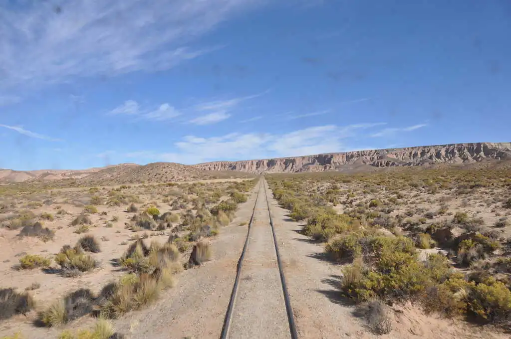Et finalement, contre toute attente, tout se passe très bien. Le ferrobus arrive (à l’heure !), nous chargeons tous nos bagages à l’intérieur sans aucun problème, les employés du ferrobus (le chauffeur, le mécanicien et son aide) nous aident très gentiment à charger les vélos sur le toit sans demander de supplément, nous montons dans ce tout petit mode de transport presque uniquement occupé par des boliviens, et nous partons (à l’heure !). Nous quittons la ville d’Uyuni en direction de Tupiza pour un trajet exceptionnel ! Les cinquante premiers kilomètres, la ligne de chemin de fer traverse une vaste plaine. Nous avons la chance de voir de nombreux troupeaux de lamas, de vigognes, mais surtout des nandous (sorte d’autruche), des viscachas (espèce de rongeurs) et même quelques flamants roses au loin. Puis, rapidement, le ferrobus se dirige vers des montagnes et nous nous y engouffrons. Là commence un trajet digne d’un petit train du far-west. Les rails serpentent au sein de paysages incroyables : canyons, montagnes colorées, ravins, etc. Parfois, il faut avoir le cœur bien accroché, quand on passe sur un petit pont de bois qui semble ne pas tenir sur grand-chose, ou qu’on aperçoit, là tout en bas, les vestiges de l’ancienne voie ferrée tombés dans la rivière à cause de la forte érosion ! Sujets au vertige s’abstenir…