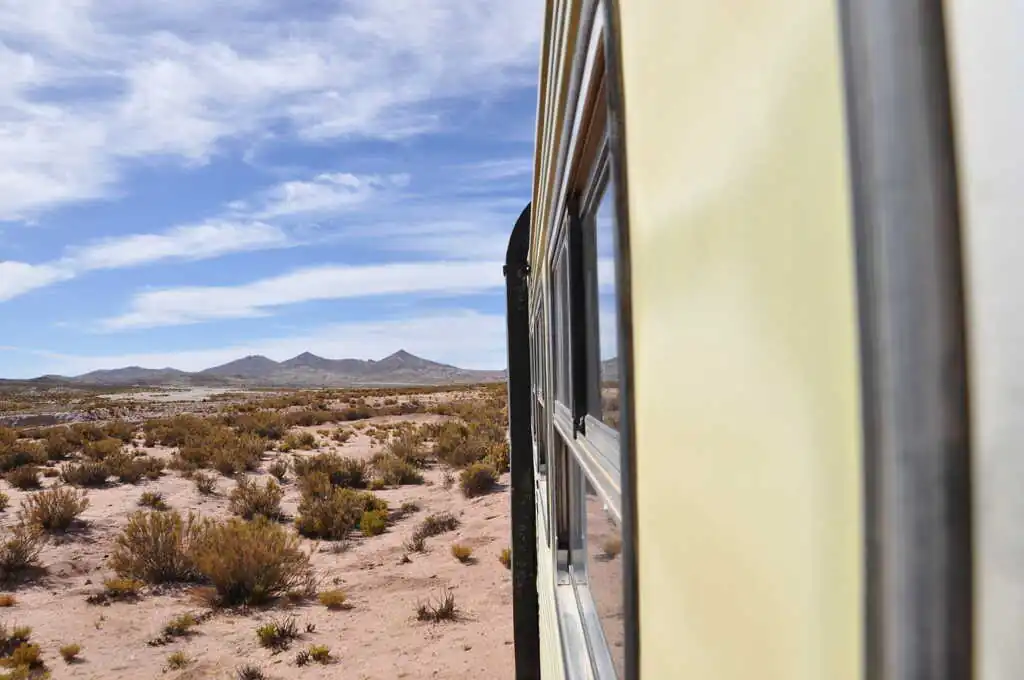 Nous profitons principalement du séjour à Uyuni pour avancer sur le travail scolaire, dormir, faire un peu d’entretien et de réparation de vélo (Sofia ayant cassé des rayons sur sa roue arrière) et manger ! Des papas rellenas (pommes de terre farcies), empanadas saltenas, salades de légumes et même… du brocoli pour le plus grand plaisir des enfants ! Puis, alors que nous regardions pour la suite du programme à vélo vers la frontière, nous prenons connaissance de l’existence du ferrobus ! Pour ceux qui comme nous ne connaîtraient pas, imaginez un bus, un simple bus, bricolé pour pouvoir circuler sur des rails de train. Capacité : 30 personnes. Nombres de passages par semaine : 1. C’est un concept. Cette ligne de ferrobus circule entre les villes de Oruro au nord et Villazon à la frontière. Deux petits soucis cependant : alors qu’une employée de la gare nous avait informé que le train ne circulerait pas le mardi de cette semaine pour cause de jour férié, nous nous rendons compte qu’il est possible d’acheter sur internet des billets pour cette même date. Nous n’arrivons également pas à savoir s’il est possible de monter à bord avec notre barda et nos vélos. Mais comme on est joueurs, on achète les billets et attendons deux jours de plus. Et, le dit mardi matin, nous sommes à la gare à 5h30 sans savoir si nous pourrons monter dans ce fameux ferrobus, ni même s’il va passer. Au pire, on est prêt à pédaler exceptionnellement tôt !