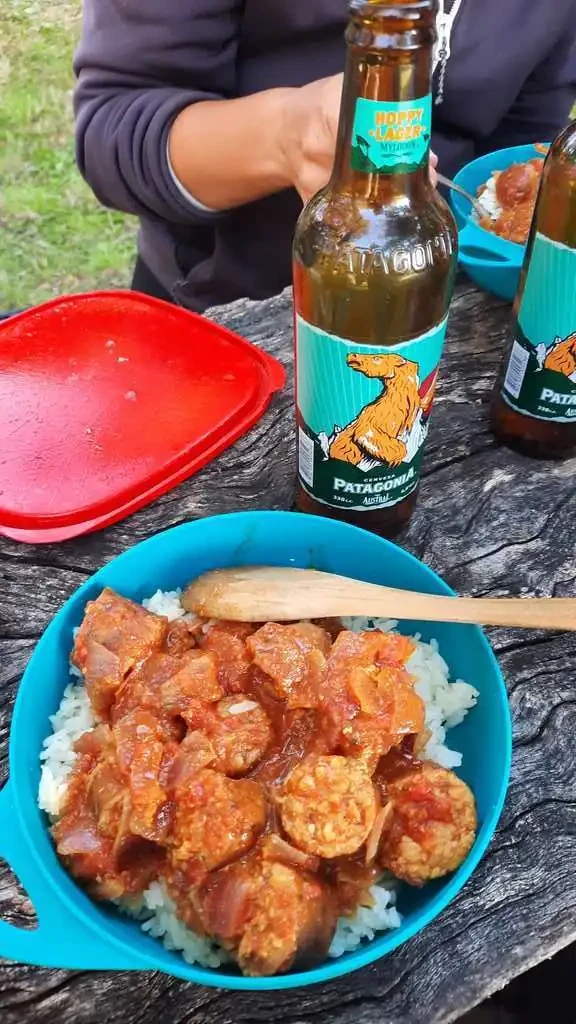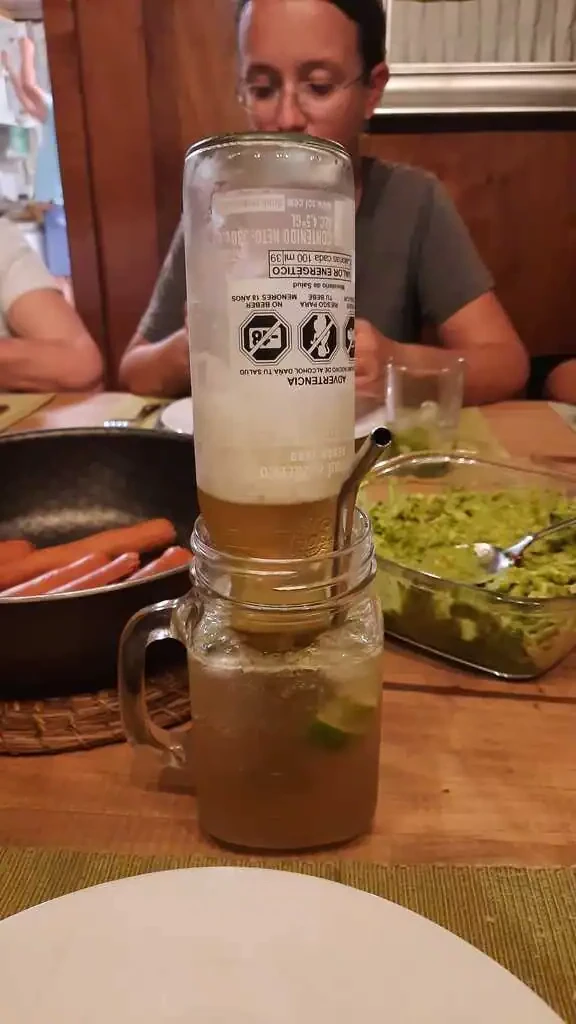La cuisine étant très bien équipée, nous sommes ravis : on va pouvoir se régaler et faire découvrir de bons petits plats de chez nous à notre famille d’adoption. Au cours de la semaine, nous cuisinons : crêpes, ratatouille (recette de mamie Sanso), quiche lorraine, gratin de courgettes, gratin dauphinois, crumble, gâteau nantais, cookies, marcellin (recette de grand-mère Bretagne) et même ! même ! un fondant au chocolat. Et dans les verres, des ti’punchs ! Un vrai tour de France culinaire ! Ça fait vraiment vraiment plaisir de cuisiner et régaler nos hôtes et apparemment, la ratatouille, c’était le comble du chic (référence à un certain dessin animé…) ! Henry et Pamela se chargent aussi de nous partager leurs recettes : merlu pané, ceviche de cochayuyo (Durvillae antarctica, espèce d’algues brunes pouvant atteindre 15 mètres de long, préparée avec du citron, des tomates et des condiments), completo… sans oublier les boissons locales : fanchop (fanta-bière), pisco, melon-vin, et tout un tas d’aguardientes (eaux de vie) dont les trop nombreux noms ne se sont pas imprimés dans nos mémoires… rapport à l’heure tardive, tout ça tout ça… Notons aussi que cette rencontre culturelle a aboutie à un métissage mettant en avant le meilleur de ces deux cultures, matérialisé par un nouveau rafraîchissement nommé le Chi-chi-pon : base de ti’punch, puis insérer dedans une bouteille de bière renversée, servir avec une paille en métal (bombilla). Le résultat est… renversant évidement ! Autant vous dire qu’entre le manque d’activité physique et les excès, nous avons refait un peu de gras !
