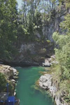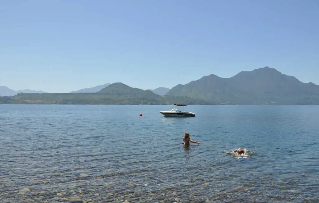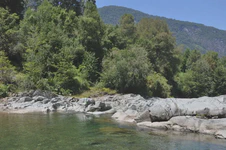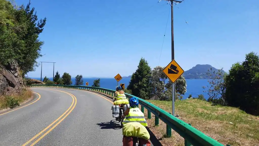Malgré le petit pincement au cœur au moment du départ, nous avons hâte de repartir ! C’est toujours comme ça pendant les pauses : un sentiment partagé entre le bonheur de quelques jours immobiles et l’envie irrésistible de remonter sur nos vélos. C’est un plaisir d’observer cela aussi chez les enfants : les premiers kilomètres, la flemme domine, mais au bout de quelques kilomètres, il y en a toujours un des trois pour dire quelques choses comme : « Aaaaaah, ça fait tellement du bien d’être de nouveau en route ! ». Nous (re)quittons donc Futrono le dimanche 18 janvier à midi passé (record battu de départ tardif, ça commence bien !), il fait grand beau, c’est 100 % plaisir ! Quitte à être lents, nous avons décidé de ne pas faire les choses à moitié et de faire le “presque” tour du lac avant de reprendre vers le sud. Cela nous permet de passer par le côté moins balnéaire et moins plat. Au bout de 15 kilomètres, aïe ! On tombe… sur un spot de baignade parfait ! Une rivière aux eaux translucides et vert profond se glisse dans une étroite gorge formée de deux murs verticaux de roches noires. Elle se déverse ensuite dans plusieurs bassins, dont un suffisamment profond pour pouvoir y sauter depuis de belles hauteurs. Ce serait criminel de ne pas faire un stop pour s’y baigner ! On descend les vélos au plus proche de la plage de galets, via un petit chemin par vraiment prévu pour (qu’il faudra ensuite remonter…), cette pause pique-nique est parfaite, sauf pour la pauvre Sofia qui ne peut pas encore se baigner pour cause de « cicatrisation en cours » !