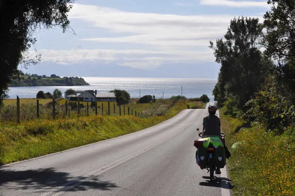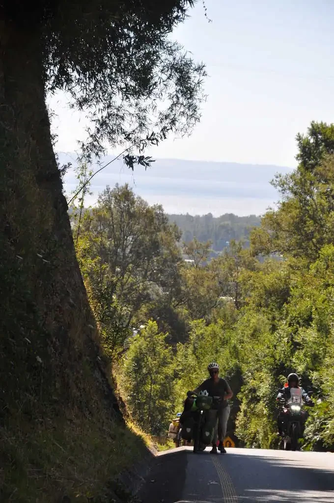 Les trois derniers jours, on arrête les bêtises et on accélère vraiment pour enfin arriver à Puerto Montt (nous passons la seconde). La route est de moins en moins tranquille au fur et à mesure que nous nous approchons de la ville. On arrive à avoir encore de beaux panoramas sur le lac Llanquihue, avec en arrière-plan les volcans Calbuco et Osorno, sentinelles imposantes du deuxième plus grand lac du Chili. La dernière nuit avant d’arriver à Puerto Montt, nous faisons encore une belle rencontre. À la recherche d’un lieu où poser la tente, nous tombons par hasard (ce fameux hasard) sur Hector, qui vit chez ses parents Rosa et Armando. Soucieux que nous soyons bien installés ce soir, ils nous invitent à camper dans leur jardin. Et, comme très souvent, nous voici aussi invités le plus naturellement du monde à pouvoir utiliser les sanitaires dans la maison, puis à partager la once (le goûter-dîner) qu’ils ont préparé pour nous. Nous passons donc encore une fois la soirée à parler avec ces inconnus, mais avec qui nous échangeons sur nos vies respectives. C’est vraiment génial d’avoir ces opportunités, de pouvoir découvrir la réalité des habitants des pays que nous traversons, aussi divers soient-ils. C’est vraiment la façon de voyager que nous aimons. Le lendemain, nous repartirons avec un sachet de biscuits au miel et une tablette de chocolat : nous sommes invités et en plus nous repartons avec des cadeaux !