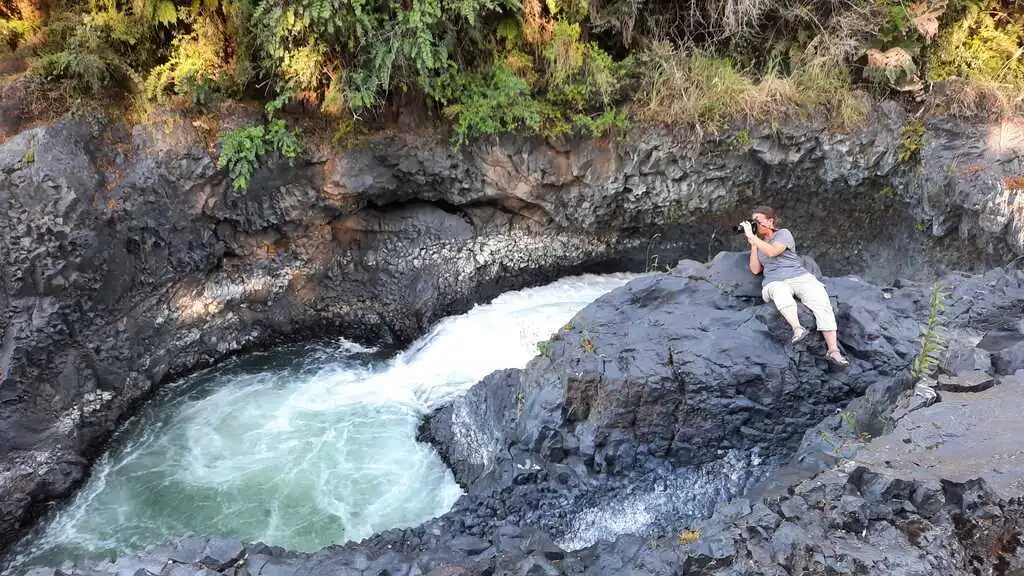 Nous reprenons la route à 16h avec encore 20 km de prévus pour atteindre notre objectif du soir : les chutes de Nilahue. Mais on commence à être rôdé, la route est totalement asphaltée, ça roule bien malgré un peu de trafic et un beau mur à mi-parcours. Et le soir, quelle récompense de pouvoir camper à côté de cette belle chute d’eau ! Nous voyons beaucoup de chutes très similaires dans cette région à l’activité volcanique passée et présente active : une rivière qui s’écoule sur une ancienne coulée de lave, forme un relief, puis se jette du haut d’une cassure dans cette ancienne coulée, où sont tout le temps visibles des orgues de basalte. Ce mélange d’eaux bouillonnantes et de roches volcaniques aux formes étonnantes, c’est toujours magique ! Au petit camping à la ferme où nous dormons, juste au-dessus des chutes, les enfants se font des copains. Et c’est parti pour une journée de pause vélo ! Nous avions promis au médecin de redémarrer doucement. La deuxième nuit, vers 22h30, alors que les enfants dorment, Sofia se réveille en hurlant en nous disant qu’elle a quelque chose dans l’oreille et que ça lui fait très mal. Petit moment de stress, on ne voit pas grand-chose dans son oreille mais elle continue à nous dire qu’elle entend que ça gratte dedans. Relativement impuissants, nous tentons les gouttes anti-douleurs dans l’oreille. Elle se calme et se rendort mais il faudra quand même vérifier tout ça.