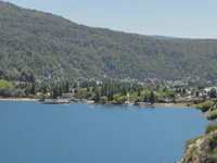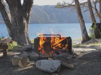 Le lendemain, nous atteignons le grand lac de Nahuel Huapi, monstre magnifique nichée entre les montagnes. Suivant l’état du ciel ou de la profondeur (de quelques mètres à 464 mètres au plus profond !), l’eau prend toute sorte de teintes superbes. Les environs du lac complètent la magie du lieu : montagnes, glaciers, dents de granit… Tout ça incite à la contemplation ! Nous continuons donc la route, mais décidons de nous installer dans un petit camping loin de tout sur les berges du lac. Nous y arrivons tôt, nous avons donc le temps : douche dans le lac, lavage des vêtements, séchage au soleil, barbecue… C’est si simple, que demander de plus ???
