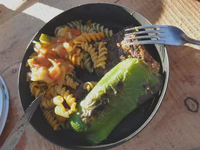 Passé cela, le reste du trajet est une pure formalité, avec en plus une bonne surprise. Car l’avantage de voyager sans guide touristique, c’est que du coup, il y a toujours plain de surprises ! Ce jour-là, par exemple, nous tombons sur les chutes de Petrohué, pour lesquelles les gens viennent apparemment de loin. C’est effectivement un bel endroit, des chutes magnifiques au pied du volcan Osorno. Et du coup, à cause de cette pluie qui nous a tellement embêté, le site est encore plus beau car le torrent est haut et encore plus sauvage ! Le soir, petit bivouac sur un terrain privé, avec bonne herbe grasse et moelleuse, et vue sur le lac s’il vous plaît, avec un très gros pot d’un kilo de manjar (merci pour le tuyau les Dou !) et des petits pains maisons offerts par la voisine. Le super pied !