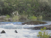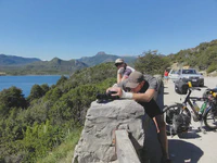 Le 2 janvier, pas du tout reposés et la tête bien enfarinée, nous remontons donc sur nos montures, beaucoup plus fringantes que nous, pour continuer notre périple toujours plus au Sud. Nous faisons nos adieux aux quelques cyclos qui ne sont pas encore repartis, en nous promettant de nous revoir avant de quitter le continent sud-américain. Le ciel est bleu, le fond de l’air est frais, le soleil brille, et nous on espère qu’on arrivera à suivre les Lego sur plus que 1 kilomètre. C’est qu’elles sont rapides ces petites bêtes là ! Les paysages sont super chouettes, nous passons de lac en lac, on se croirait dans les Alpes. On se sent bien !