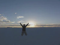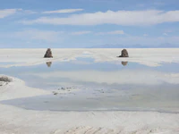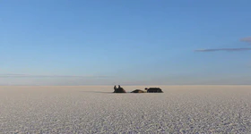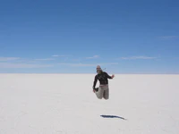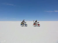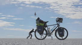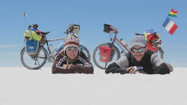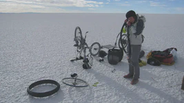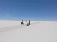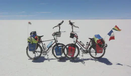 Et là ! Désenchantement : nous imaginions que rouler sur le Salar serait doux, agréable et facile. Il n’en est rien, car la surface est composée de nombreuses plaques de sel, qui rendent la progression très chaotique. Mais le spectacle est superbe, du blanc à droite, à gauche, devant, derrière, à perte de vue, c’est étourdissant. Durant nos premiers kilomètres, aucun d’entre nous ne parle : nous nous enivrons du paysage. Pour profiter encore plus de cette chance que nous avons, nous décidons de dormir en plein milieu du Salar. Le vent se lève fort, mais qu’importe, nous avons de bonnes tentes et un caillou pour réussir à planter les sardines dans la croûte de sel vraiment très solide. Au crépuscule, l’ambiance est magique : le soleil enflamme le ciel, le vide se fait tout autour de nous, le vent nous glace, et le sel, poussé par le vent, émet un bruit de carillon qu’on croirait sorti de nos imaginations. Dormir au milieu de tout ça est une expérience inoubliable.
