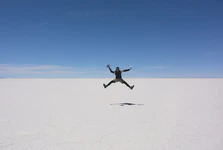 Le lendemain, nous complétons la traversée du Salar, du Nord au Sud (80 kilomètres en tout). Nous passons par l’île Incahuasi, stop obligé de 4x4 des tour-opérateurs. Nous sommes bien contents d’être indépendants, nous avons au moins la chance de nous arrêter quand nous voulons, où bon nous semble, et d’éviter ainsi les endroits authentiques mais surpeuplés. Nous faisons évidemment la pause photos rigolotes : nous sommes là, comme 4 andouilles, à prendre des pauses pas naturelles du tout au milieu de nulle part. À voir de loin, ce devait être assez amusant ! Et enfin nous sortons du Salar, une belle expérience.