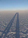 Le lendemain, quatrième jour de piste, notre dernière étape vers le Salar de Uyuni nous attend. Le ton est tout de suite donné : la piste se dégrade. Finie la nouvelle piste, place aux bons gros cailloux qui tapent dans les roues et arrêtent le vélo, au sable bien profond, vous savez, comme à la plage. En plus de ça, le vent se lève. Du bonheur ! Mais le paysage est magnifique, toute la journée nous contournons le splendide volcan Thunupa, majestueux, nous rencontrons de nombreux lamas, et enfin, en début d’après-midi, le Salar est en vue. Il s’agit du plus grand lac asséché de sel du monde. C’est assez émouvant de le voir enfin, ce mythe pour de nombreux cyclo-touristes en vadrouille en Amérique du Sud. Elle est assez surréaliste, cette grande tache blanche au milieu des volcans. De haut, on dirait comme un grand bout de banquise qui se serait perdu là… Après avoir fait le plein en eau (pas d’approvisionnement possible sur le Salar), enfin nos roues se posent sur la croûte de sel !!