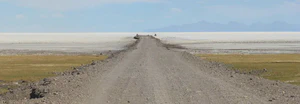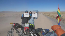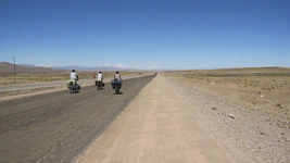 Après le village de Huari arriva enfin le moment un peu redouté par Marie : l’adieu à l’asphalte et l’entrée sur la piste pour plus de 400 looOOOoongs kilomètres. Parce qu’on se marre bien sur les photos, mais quitter un bon revêtement pour s’engager dans trois semaines de piste, faut quand même se motiver ! Dès le début, nous sommes catapultés directement dans un univers très plat, sableux et désertique. Le premier après-midi est magnifique et très impressionnant : avant même le déjeuner, nous voyions loin, très loin au fond de la morne plaine qui s’étale devant nous l’objectif du jour. Le village perché de Quillacas. Nous croisons des lamas, et plus étonnant, des gens, alors qu’il nous semble bien qu’il n’y ai pas grand-chose à des kilomètres à la ronde. Deuxième jour de piste, une bonne surprise nous attend. Nous naviguons guidés par un très bon topo rédigé par d’autres cyclistes passés quelques années avant nous[^3], la piste était prévue comme très mauvaise. En fait, depuis leur passage, celle-ci a commencé a être refaite et elle est bien roulable tout du long.