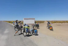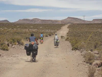 Nous sommes super contents, c’est un peu un soulagement. On aime bien se faire mal mais il y a des limites… ! Les jours qui suivent, nous sentons vraiment que nous poussons les portes du désert pour nous y enfoncer. Le peu de végétation disparaît petit à petit, laissant place à un paysage de sable et de caillasse. L’eau commence à manquer, il faut penser à organiser les réapprovisionnements. Les plaines arides, sèches et balayées par le vent s’enchaînent. Comment des gens peuvent-ils vivre et cultiver ici ??? Après trois jours à ce rythme, nous entrons dans Salinas de Garci Mendoza, bien contents d’être déjà arrivés là.