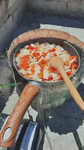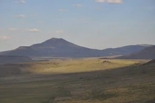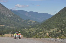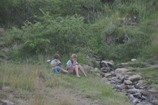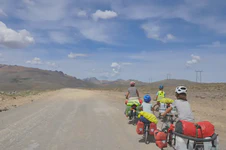 Autant la piste est très mauvaise, autant les paysages sont magnifiques. Après un petit bivouac tranquille au bord d’une rivière (les enfants étaient ravis de se baigner), nous continuons de grimper dans la bonne humeur vers un plateau. Cela se fait malheureusement sous un orage et une pluie battante pendant deux heures, dans un milieu complètement ouvert où nous sommes totalement exposés aux éléments. Bon, au moins on aura pris une bonne douche ! La pluie arrêtée, nous finissons la traversée de ce vaste plateau recouvert de roches et cendres volcaniques et passons au pied d’un volcan rouge étonnant. Puis nous entamons une descente vraiment sympa sur la piste qui est maintenant composée de cendres volcaniques très claires, tassées en talus sur les bords de chaque côté un peu comme la neige au bord des routes en hiver. En passant dessus en vélo, cela produit un léger bruit de frottements comme des skis sur la neige. Tout nous donne vraiment l’impression d’être sur une piste de ski !