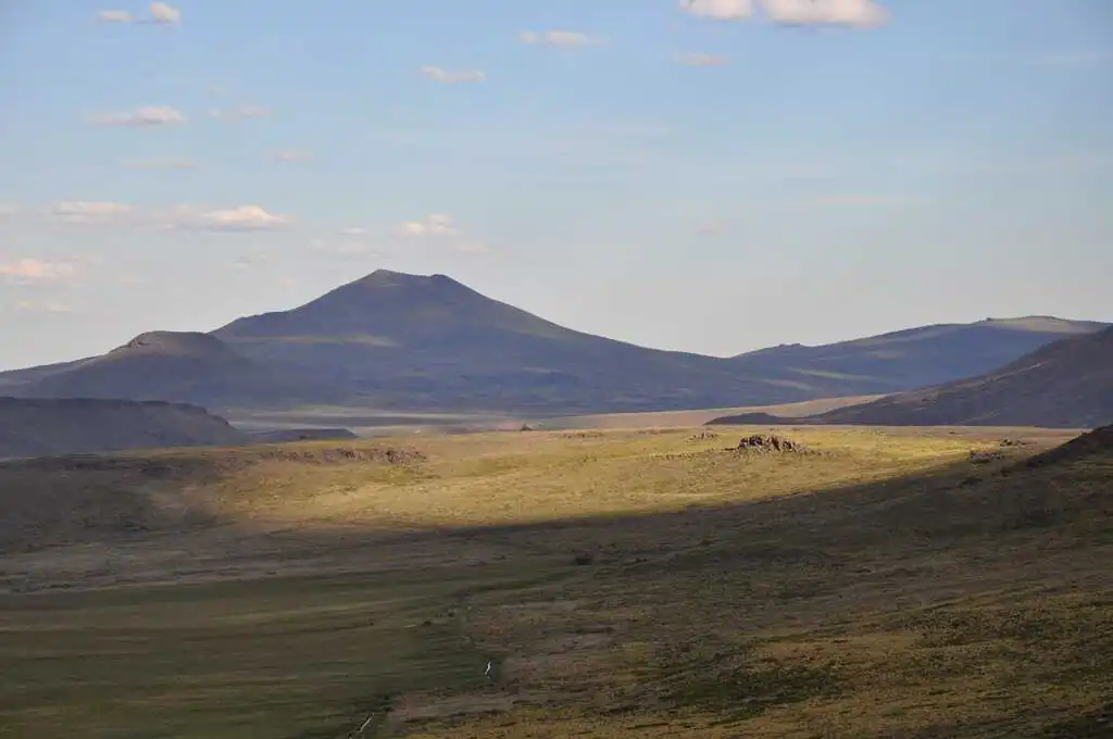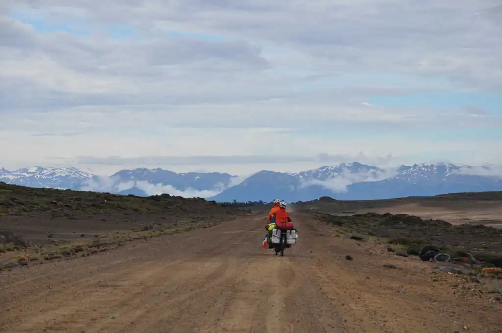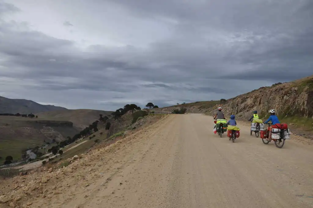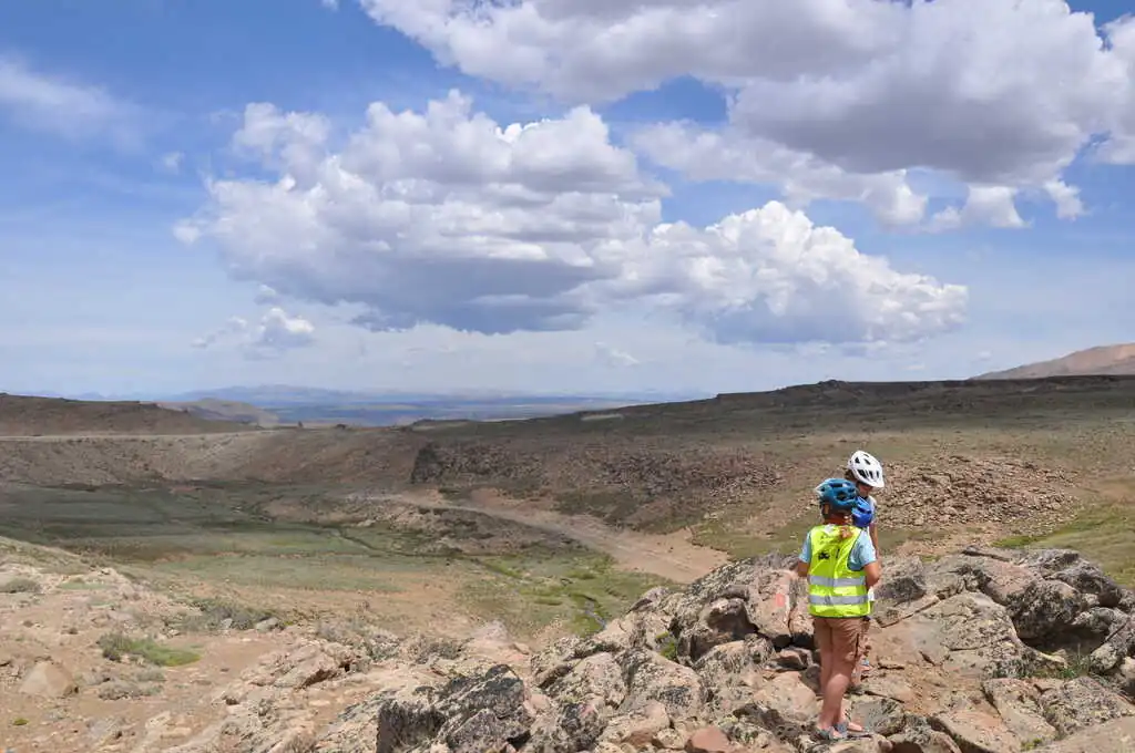 Autant la piste est très mauvaise, autant les paysages sont magnifiques. Après un petit bivouac tranquille au bord d’une rivière (les enfants étaient ravis de se baigner), nous continuons de grimper dans la bonne humeur vers un plateau. Cela se fait malheureusement sous un orage et une pluie battante pendant deux heures, dans un milieu complètement ouvert où nous sommes totalement exposés aux éléments. Bon, au moins on aura pris une bonne douche ! La pluie arrêtée, nous finissons la traversée de ce vaste plateau recouvert de roches et cendres volcaniques et passons au pied d’un volcan rouge étonnant. Puis nous entamons une descente vraiment sympa sur la piste qui est maintenant composée de cendres volcaniques très claires, tassées en talus sur les bords de chaque côté un peu comme la neige au bord des routes en hiver. En passant dessus en vélo, cela produit un léger bruit de frottements comme des skis sur la neige. Tout nous donne vraiment l’impression d’être sur une piste de ski !