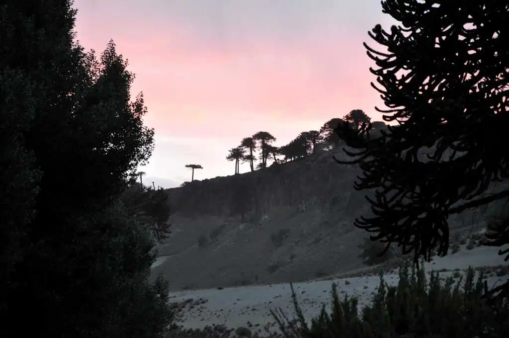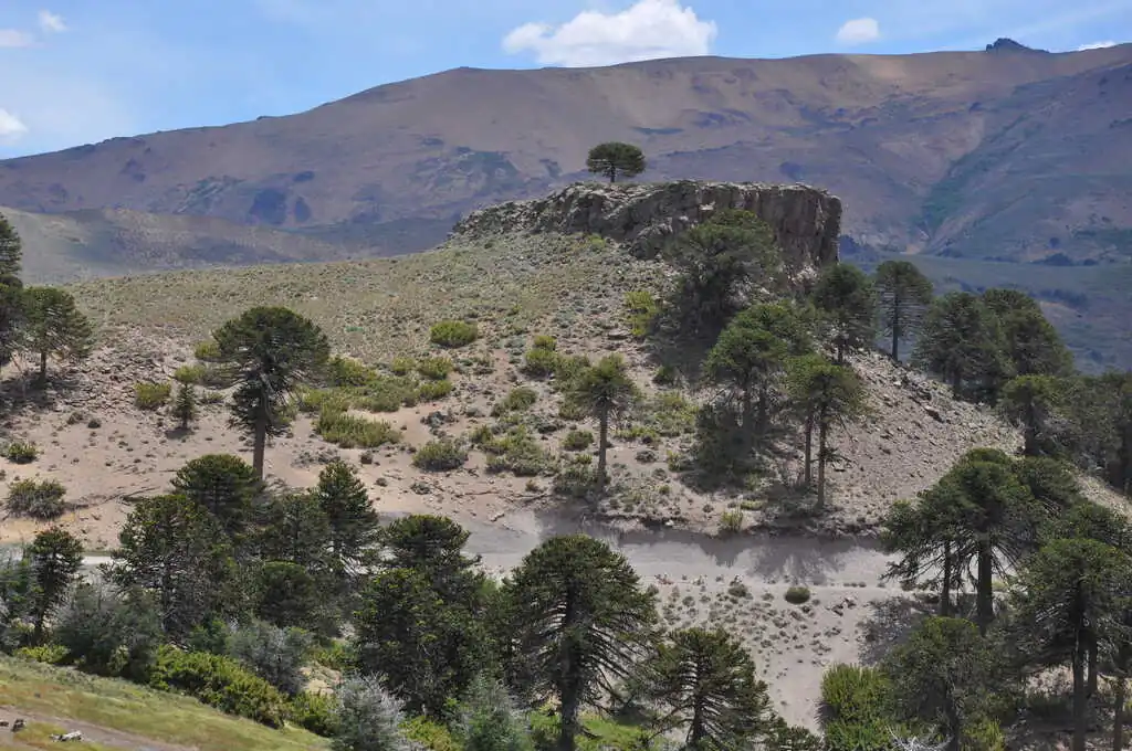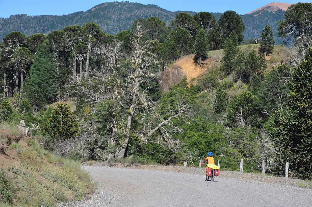Au deuxième jour, les choses se corsent un peu avec la fin de l’asphalte au niveau du hameau du Primeros Pinos. Ici, les hivers doivent être rudes au vu des photos des chalets enneigés affichées dans la petite tienda où nous achetons quelques paquets de gâteaux pour compléter le ravitaillement. Internet est encore disponible jusque dans des coins reculés comme ici, cela nous permet de passer un petit coup de fil à notre amie Sophie, médecin généraliste et experte en médecine de brousse, pour faire une petite vérification sur un potentiel petit pépin de santé pour Alicia. C’est super confortable de pouvoir lever des petits doutes et d’avancer plus serein grâce à ses conseils… Merci Sophie ! A Primeros Pinos apparaissent les premiers pins Araucaria. Ces arbres massifs et extrêmement vieux, symboles de la région, produisent des pignons longs de plusieurs centimètres, délicieux, que l’on peut consommer bouillis ou cuits au barbecue. On les appelle Désespoir des singes en France à cause de leurs épines épaisses, rigides, piquantes et très resserrées.
