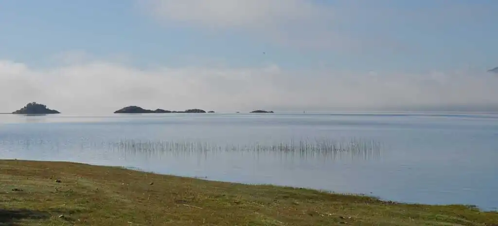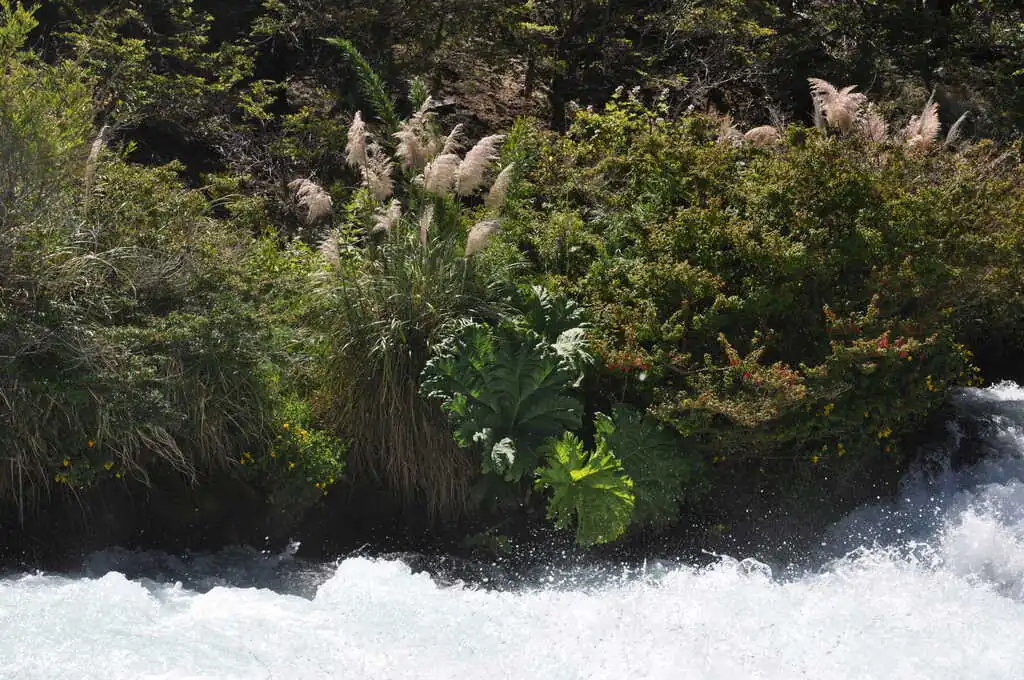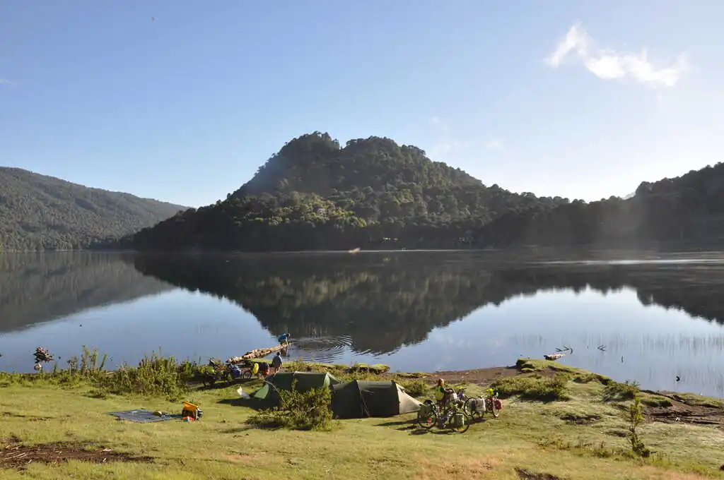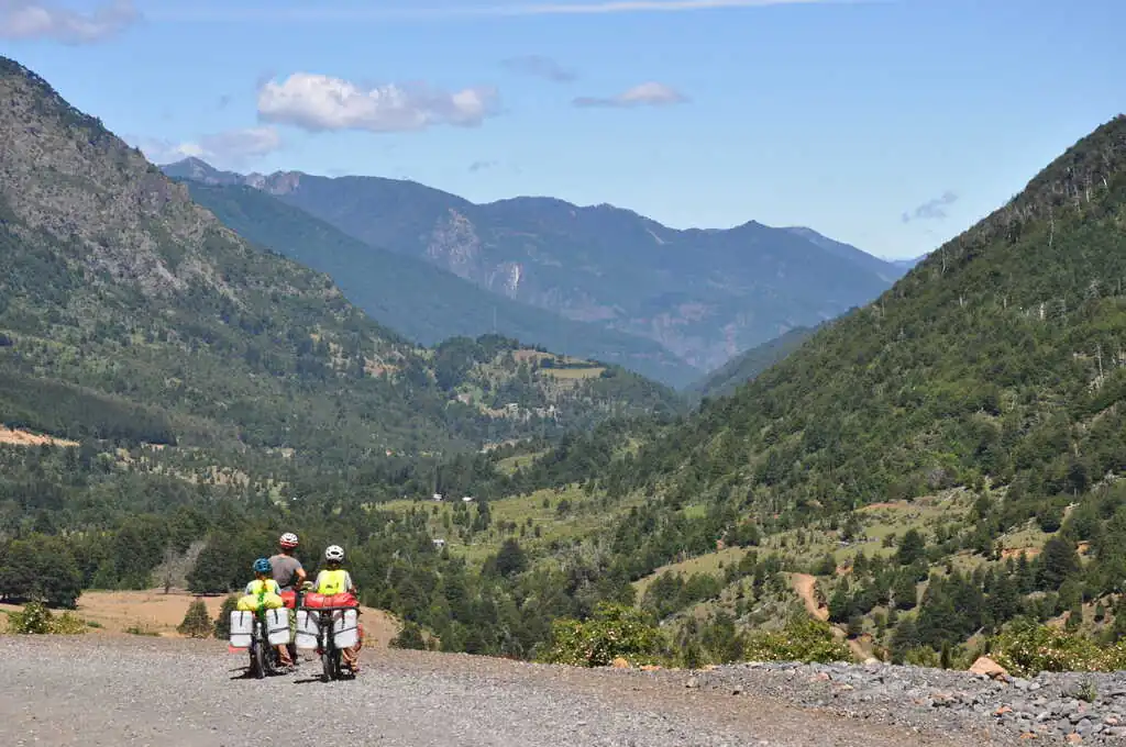 C’est dans cette descente que LE changement opère : en quelques kilomètres, nous quittons définitivement les paysages secs et semi-désertiques et plongeons avec délice vers des paysages de forêts ! L’apothéose est atteinte lorsqu’au détour d’un virage, le lac Icalma apparaît, magnifique, déroulant une superbe plage déserte. Ni une, ni deux, les vélos sont posés sur le bas-côté, nous enfilons les maillots de bain et sautons à l’eau ! Nous poursuivons le lendemain en montée jusqu’au poste frontière argentin, puis entrons au Chili par la toute petite frontière d’Icalma. Dès les premiers kilomètres, on retrouve la piste (que nous avions quitté au lac Icalma) et cette manie chilienne : ils ne connaissent pas les lacets ! Les pentes sont raides en montée comme en descente. Mais les paysages sont tellement beaux !! Nous naviguons entre de belles montagnes arrondies, des volcans et des lacs. Notre premier bivouac chilien est parfait : au bord d’un lac, sur de l’herbe bien grasse et humide, de l’eau douce à portée de main, des arbres partout où porte le regard. Nous profitons tous de cette soirée paisible des étoiles plein les yeux.