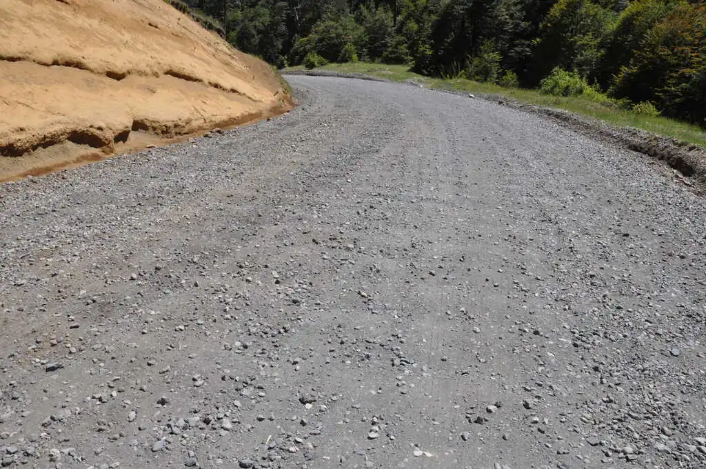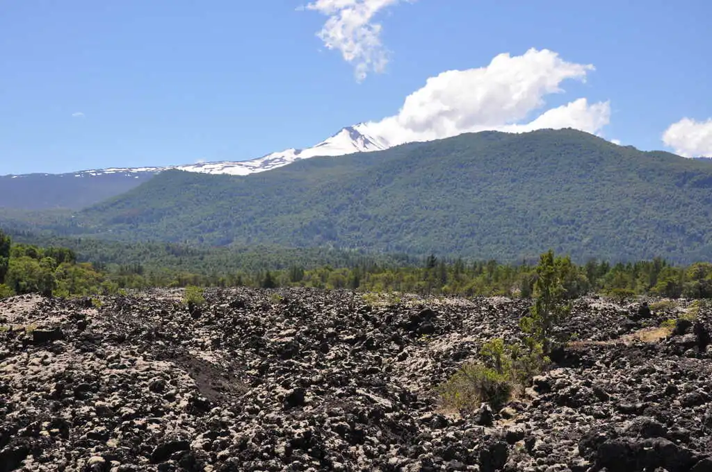 Dernier jour avant l’arrivée à Melipeuco, c’est dur, la fatigue commence à se faire sentir après ce dénivelé et cette piste qui, décidément, empire depuis la frontière chilienne. Nous commençons par 7 kilomètres de montée raide, trop raide et trop “glissante” avec ce ripio en mélange de galets ronds, de poussière et de tôle ondulée. Il nous faudra deux bonnes heures pour en arriver à bout. Un rapide calcul vous montrera que nous avancions donc en moyenne plus lentement que des piétons. On organise un relai pousse-pousse pour monter les vélos en s’entraidant, ça demande de la patience mais les enfants sont motivés et ça le fait bien. De toute façon, cela nous arrivera sûrement souvent dans les semaines à venir ! Puis nous entamons enfin la dernière loooongue et fastidieuse descente sur une piste en aussi mauvais état que précédemment, finalement plus fastidieuse que la montée ! Après quelques kilomètres, nous comprenons qu’il s’agit probablement d’une « piste témoin », vitrine du savoir-faire unique des Chiliens en la matière (inspiré par les savoir-faire bolivien et périvien mais sublimé) : tôle ondulée sans discontinuer sur des kilomètres, bac à sable pour que les roues s’y enfoncent, graviers de toutes tailles (petits pour cacher les bacs à sable, moyen pour glisser, gros pour provoquer les dérapages et éventuellement provoquer de belles écorchures) et enfin et surtout, l’élément le plus important, une pente très importante pour accentuer le danger. Nous roulons donc les mains serrées/crispées sur les freins, à la folle vitesse de… cinq à neuf kilomètres à l’heure. C’est long. La pauvre Alicia, avec son chargement uniquement à l’arrière, chute plusieurs fois et commence à fatiguer. On avance le plus doucement possible mais ça tire un peu. Puis, enfin, on retrouve l’asphalte, et on se laisse glisser entre les champs et les bois, dans les odeurs de fleurs et de résineux. Peu avant notre objectif, la route nous fait traverser une coulée de lave de 1751, issue du volcan qui se dessine, enneigé, en toile de fond. Nous arrivons finalement à Melipeuco, cinq jours après avoir entamé cette magnifique traversée de la Cordillère. On s’est régalé ! Le temps n’étant pas au beau fixe et les troupes ayant besoin de repos, nous nous sommes trouvés une petite cabane avec… un poële !! Nous nous reposons donc deux jours, espérant laisser passer le mauvais temps… avant de repartir pour la suite de nos aventures entre les volcans !