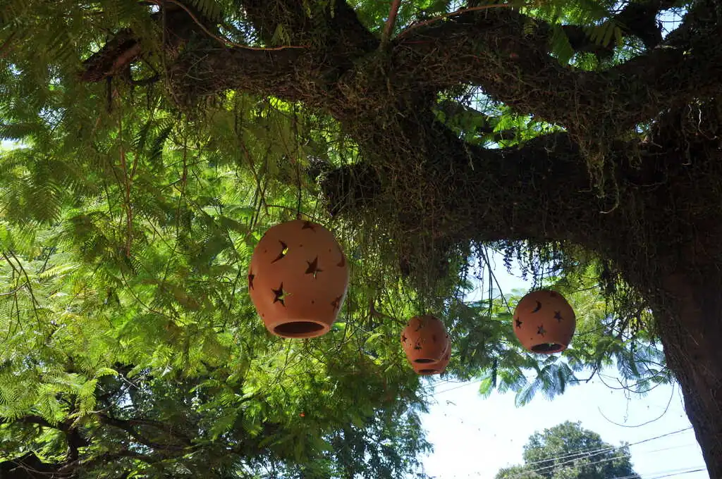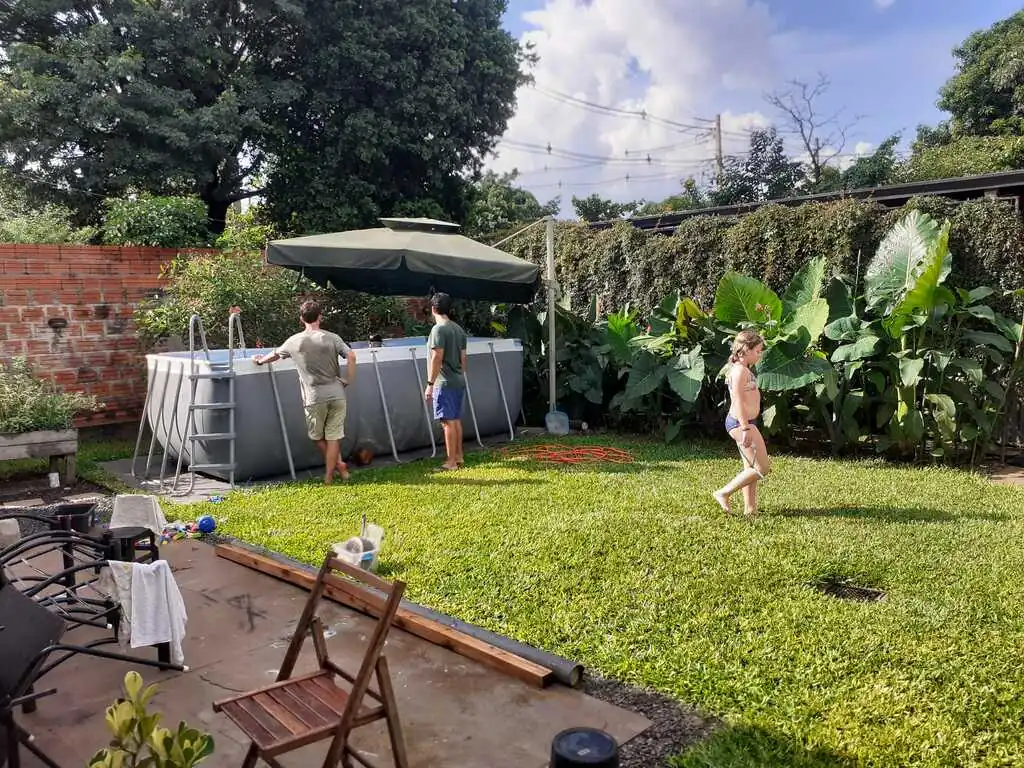 Nous arrivons trempés de sueur chez Saul, Kuki et leurs deux enfants, qui font partie du réseau Warmshowers (via lequel nous accueillons nous-même des cyclos chez nous en France) et qui ont accepté de nous héberger pour quelques jours (enfin deux nuits au départ, mais ils sont moins dupes que nous en ce qui concerne le temps réel que nous allons passer chez eux apparemment !). Nous sommes plus que ravis de commencer notre séjour en pays inconnu chez des locaux plutôt que dans n’importe quel logement impersonnel. C’est la meilleure façon de ressentir l’ambiance, de saisir les premières clés de compréhension de la culture locale, de prendre des bons tuyaux, de bonnes adresses, de noter les lieux intéressants à visiter, de recevoir des conseils quant aux routes à emprunter, et bien sûr de faire de super rencontres. Nous ne sommes pas exactement dans Asuncion, la capitale du Paraguay, mais dans une ville de son agglomération : Nembly. Ici, les petites rues sont empedradas, pavées avec des mauvais pavés inégaux qui rendent la circulation en vélo super désagréable, et celle en voiture extrêmement lente et bruyante, ou en terre rouge. La ville paraît de bric et de broc – route en piteux état, empilement de déchets dans les cours d’eau et les “trottoirs”, vendeurs de rue partout, jardins ressemblants à de vieilles brocantes converties en décharges privées, quelques zones de bidonville – mais en y regardant d’un peu plus près, la plupart des maisons semblent toutes proprettes et mignonnes à l’intérieur. La jolie maison de Saul et Kuki dénote dans le quartier, avec son beau jardin entretenu. C’est normal, c’est en fait leur métier : ils dirigent une entreprise de paysagisme. Nous avons un petit espace pour nous dans un local au fond du jardin, ce n’est pas immense mais c’est parfait !