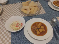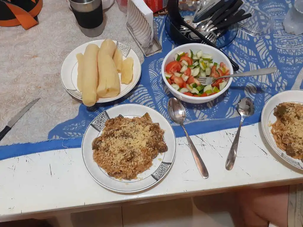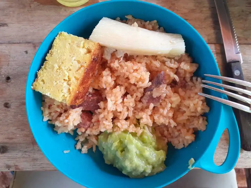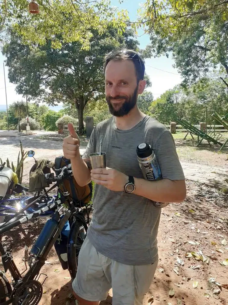 Nous passons ces premiers jours à tenter de nous adapter à la chaleur écrasante et à l’omniprésence des moustiques. Et encore ! Il paraît que les températures redescendent… Leçons, lessives, le classique ! Mais avec un bonus piscine pour se rafraîchir ! Bon, on ne va pas se le cacher, ce séjour est essentiellement culinaire ! Non seulement Saul et Kuki nous régalent, mais en plus de ça, nous nous faisons inviter chaleureusement par la famille de Saul. Sa sœur et ses parents nous convient à plusieurs reprises chez eux et son papa tient même à venir nous apprendre à cuisiner un plat typique chez Saul, et nous ne pouvons pas repartir de Nembly sans de nombreuses victuailles préparées par leur soin et glissées dans nos sacoches. Cela nous permet de découvrir d’entrée de jeu la culture culinaire du Paraguay, riche métissage entre les traditions guaranis (le peuple premier de cette région) et des apports extérieurs, notamment des colons espagnols : guiso (genre de mix entre ragoût et risotto, on appellera ça un ragousotto), asado (barbecue, évidemment !), vori vori (soupe de poulet avec des boulettes à base de maïs), chipas con cocido (sorte de petit pain à base de farine de manioc, servi avec une infusion de maté avec de l’eau et du charbon de bois – voir un peu plus bas pour la recette), sopa paraguya (eh non, ce n’est pas une soupe, mais une sorte de cake au maïs avec ou sans garniture au poulet et aux légumes), pizza, tallarines (plat de viande et de pâtes)… De notre côté, nous leur avons concocté une grosse pile de crêpes, une belle tarte au citron meringuée et un marcelin (recette secrète de Grand-mère Bretagne), et tout le monde a eu l’air de se régaler !! Ces moments de partage culinaire sont bien évidement aussi l’occasion de discussions et de découverte mutuelle de nos cultures respectives.