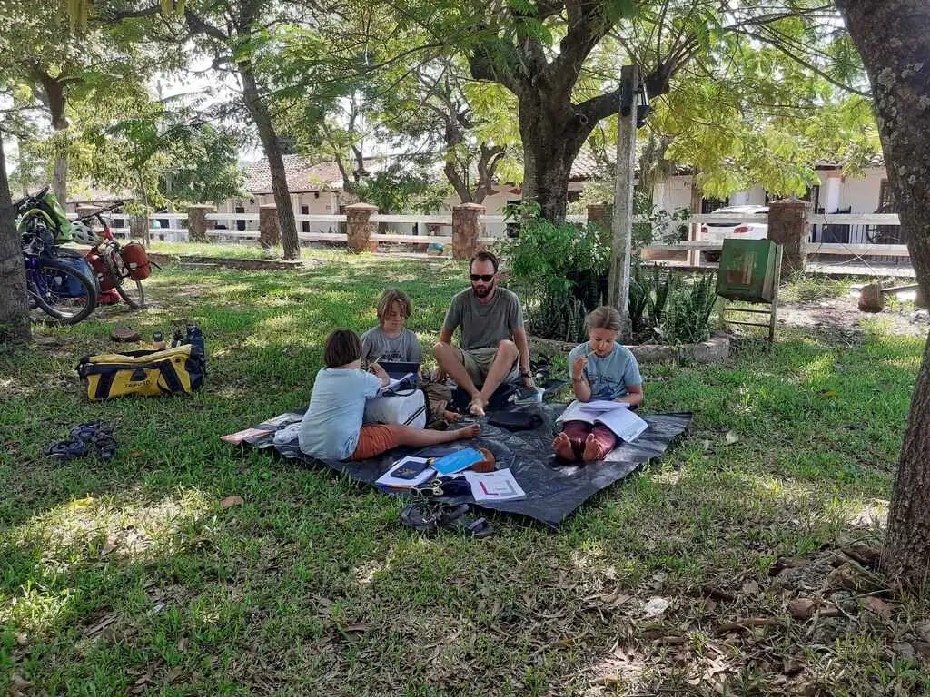 Première journée de vélo, on appréhende la chaleur ! Alors, on décolle à 8h en espérant faire un maximum de kilomètres le matin. Nous sortons progressivement de l’agglomération. Les sorties de ville ne sont jamais très agréables, mais là ça se fait plutôt bien en évitant les axes majeurs. Les conducteurs en tous genres (camions, voitures, motos, etc.) sont plutôt attentifs à notre caravane et la route est agréable. Et c’est plat par rapport à la Cordillère des Andes ! Notre première étape est Aregua, qui s’avère être une jolie petite ville. Nous y arrivons vers 11h30, et nous installons à l’ombre des manguiers derrière la cathédrale pour déjeuner, faire les leçons et surtout laisser passer la chaleur du milieu de journée. En milieu d’après-midi, nous quittons notre cachette pour commencer à chercher un endroit où passer la nuit. On tente notre chance d’abord chez les pompiers (ceux d’Amérique du Sud sont habitués à filer des coups de main aux voyageurs à vélo), mais il n’y a personne… En face, un édifice original attire notre attention : il s’agit d’une « bio-école », comme indiqué sur la pancarte à l’entrée. Et quelqu’un finit par arriver : la fondatrice du lieu ! Elle nous présente le lieu (avec la majorité des bâtiments en auto et éco-construction), qui est une fondation et propose des cours gratuits d’arts et de sports aux membres de la communauté locale. Le projet est super intéressant !! Et en deux temps, trois mouvements, on se retrouve invités à dormir sur le site pour la nuit ! Puis à passer la soirée en compagnie de Sévé (“évadée” de Suisse), de Javo et de leurs trois enfants, une sacrée famille ! Puis ils nous convient chez eux le lendemain ! Et ça tombe à pic car les enfants déclenchent tous les trois une otite, sûrement la faute à un peu trop de piscine à Nembly…