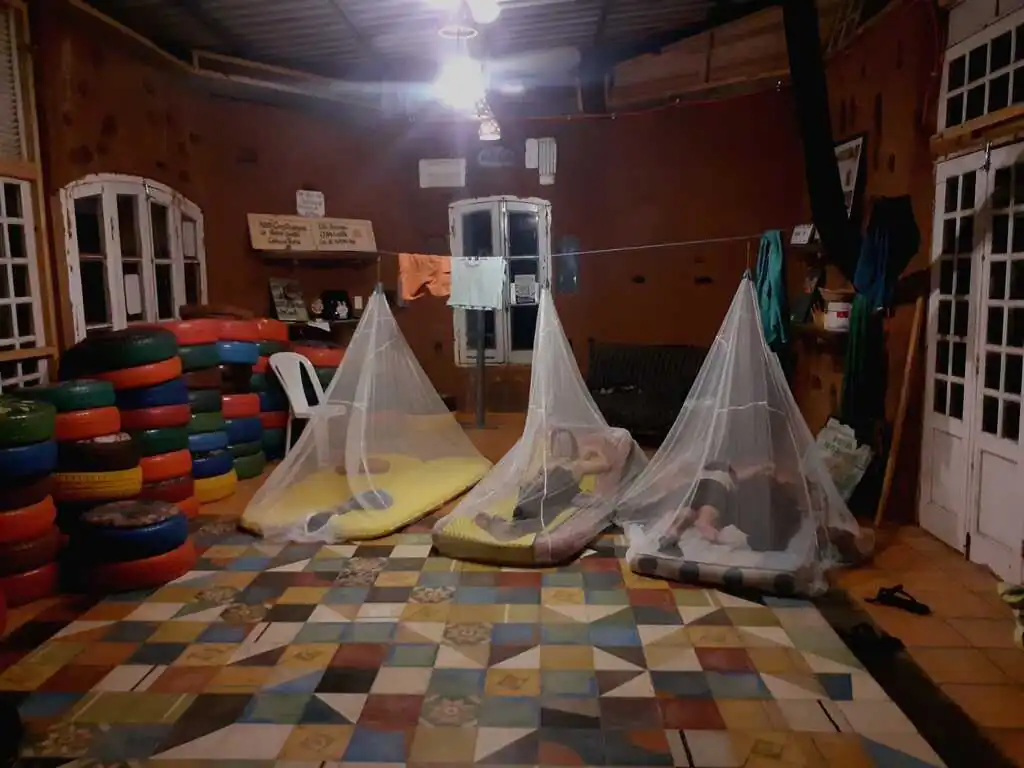 En cette semaine sainte, les Paraguayens ont des jours fériés, tout le monde en profite pour aller à la campagne passer du temps avec ses proches. En repartant de chez Sévé et Javo, le trafic est dense mais ça roule bien. En revanche, on sent que ça tire fort du côté des enfants. Ces nombreux jours consécutifs de chaleur intense et de partage dans diverses familles les ont fatigués, l’otite n’arrange rien. Ni la motivation ni l’énergie ne sont au rendez-vous, Nahuel est même vraiment raplapla… Bon, ce midi-là, on se trouve une petite maisonnette à louer pour reprendre des forces. Nahuel sombre dans le sommeil d’où nous le tirons une heure et demie plus tard afin qu’il dorme aussi cette nuit. Les filles aussi se reposent, tout le monde reprend du poil de la bête !