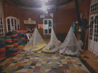 À peine nous sommes nous présentés (et l’abrazo de la part de Wojciech donné), que Nibely nous accueille à bras ouverts : il nous fait entrer chez lui, nous prépare un jus de pomelo coupé à l’eau fraîche, s’assure que nous soyons bien installés, que les enfants n’aient pas trop chauds. Et en moins de 10 minutes, il nous propose de nous emmener à sa petite maison dans les collines de Chololo et de nous la prêter pour quelques jours. Incroyable ! Mais quelle gentillesse ! Nibely a le sourire jusqu’aux oreilles, il a l’air sincèrement content de nous voir là, avec les enfants, sur sa terrasse : « Je suis vraiment heureux que vous vous soyez arrêtés chez moi, quelle joie ! ». Complètement dingue cet accueil ! Une grande banderole peinte déclare sa philosophie au-dessus de son atelier : « Le monde est ma patrie, les êtres humains mes frères, faire le bien ma religion. ». Voilà, que dire de plus ? Nibely est sincèrement heureux de nous rencontrer et de pouvoir nous héberger dans sa maison de vacances situé dans les hauteurs à quelques kilomètres, sans attendre rien d’autre en retour que le plaisir de passer du temps ensemble… C’est génial !