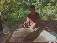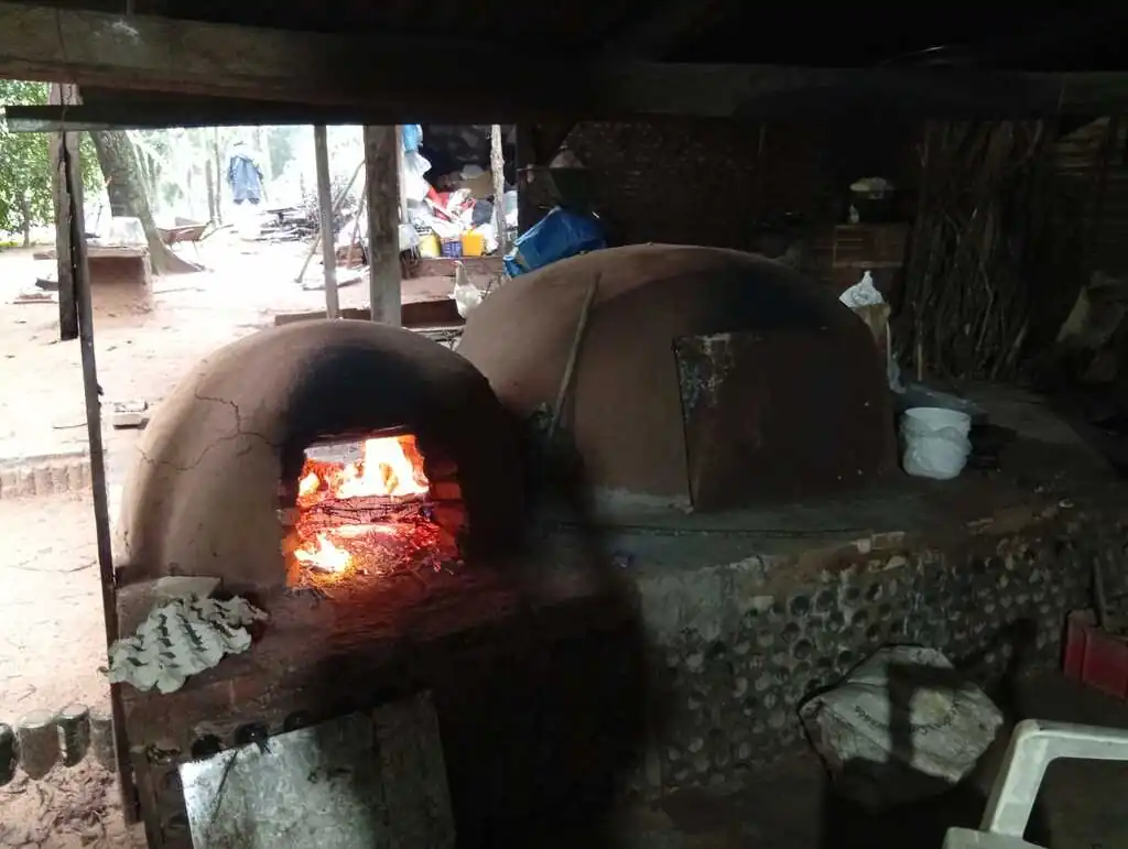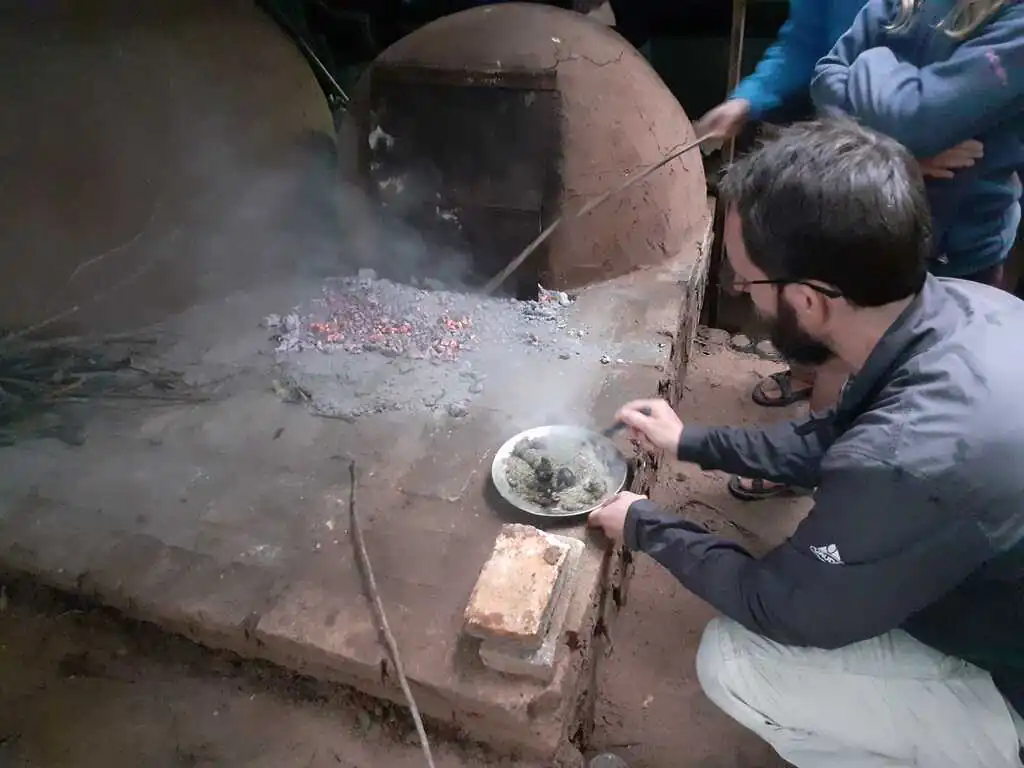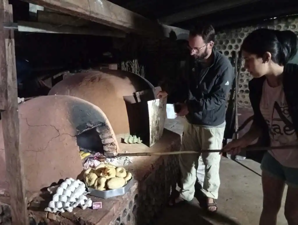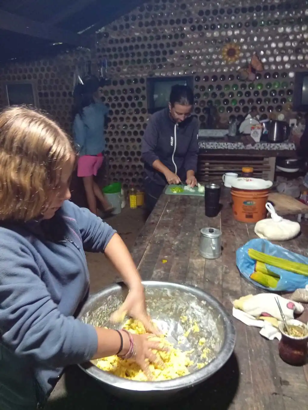 Au deuxième jour de ce séjour, alors que nous rentrons nous baigner dans un petit arroyo (petite rivière), la famille propriétaire du terrain nous invite très spontanément à revenir le lendemain pour confectionner des chipas con cocido avec eux. Ca ne se refuse pas ! Nous voilà donc le lendemain installés dans leur immense “cuisine” en extérieur, un toit, un mur en terre et en bouteilles de verre, au beau milieu d’un jardin tropical. On lance d’abord la chauffe du four à bois, construit en terre et en brique. Puis nous apprenons la recette et les gestes pour fabriquer les chipas, véritable marque de fabrique de la cuisine paraguayenne. Il s’agit de petits pains à base de farine de manioc et de fromage maison, très similaires aux paos de queijo brésiliens pour les connaisseurs. Il y en a de plusieurs sortes : chipas classiques, chipas au fromage (avec du fromage frais dedans qui fond pendant la cuisons), chipas m’boca (cuites à la broche), chipa so’o (fourrées à la viande), etc. Nous les mettons ensuite à cuire dans le four à bois bien chaud. Et nous préparons le fameux cocido ! Cette boisson est, selon les paraguayens, LA boisson qui accompagne la dégustation des chipas ! Au Paraguay, le téréré est la boisson nationale, c’est très similaire au maté plus connu, mais avec de l’eau glacée. Pour le cocido, même base : l’herbe à maté. On dispose de l’herbe et du sucre dans un grand plat, que l’on mélange avec des charbons ardents sortis du four à chipas. Résultat : l’herbe cuit et le sucre caramélise. On verse le tout dans de l’eau chaude (charbons compris), on filtre et c’est prêt ! Et c’est délicieux ! C’était un super moment avec cette famille super gentille. Et ce qui est super dans le fait de pouvoir cuisiner des plats typiques, c’est de comprendre plein de petits détails culturels : pourquoi cette forme ronde pour les chipas ? Pour pouvoir les sortir facilement du four chaud avec un petit crochet. Pourquoi le cocido avec les chipas ? Parce qu’on utilise les charbons qui ont cuits les-dites chipas ! Bref, c’était super intéressant et très chouette comme moment !