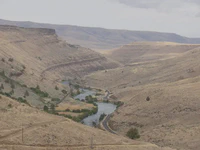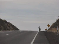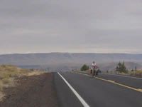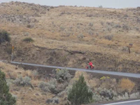 Le lendemain, nous sommes partis du fond du canyon de Maupin pour une nouvelle grosse journée : 80 kilomètres avec une première passe à 1 100 mètres d’altitude. Levés à 6 heure du matin, nous avons commencé par 3 heures et demi de montée (30 kilomètres) sans la moindre interruption. La montée était spécialement difficile : nous évoluions plus à travers un paysage de collines que de montagnes, et pourtant l’altitude ne cessait d’augmenter. Et comme la veille, on ne voyait jamais au-delà de la colline suivante, ce qui nous empêchait d’en voir la fin. On aurait bien aimé trouver les masseurs du tour de France au sommet ! Malgré l’effort, cette journée a été splendide : le paysage complètement désertique sur des dizaines de kilomètres étaient très impressionnants. Cette route étant très peu passante, l’impression de solitude était encore plus grande. Nous avons même eu droit à la compagnie d’un coyote (notre premier et sûrement pas le dernier) qui a trottiné derrière les vélos pendant quelques minutes.