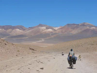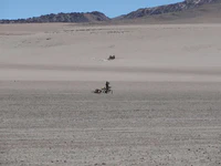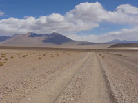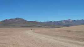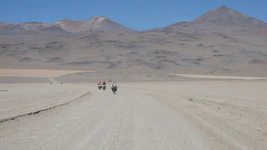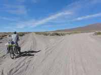 À la sortie du Salar, nous mettons une journée à rallier San Juan de Rosario. Et la piste présage bien de ce qui nous attend ! Elle se dégrade petit à petit, se transformant progressivement en ruban de tôle ondulée ou de sable, voire les deux conjugués. Du bonheur ! La fin de journée est fatigante : à partir de maintenant, la piste se divise régulièrement en plusieurs. Aucune indication bien-sûr, il est très facile de se perdre. Et ce qui devait arriver arrive : nous perdons la piste principale pour nous échouer sur une secondaire, en très mauvais état, ce qui nous oblige à pousser les vélos sur de bonnes distances. En plus de ça, le vent se lève, des tornades traversent la plaine et des rafales violentes nous balayent en nous balançant des pelletés de sable. C’est un sketch ! Le ton est donné : wouhou !