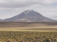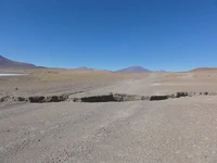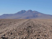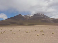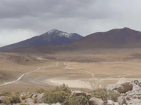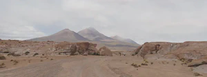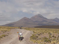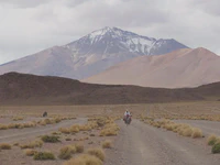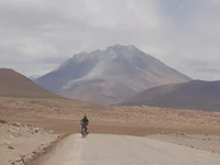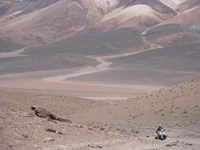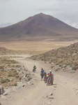 Le deuxième jour, c’est finalement plus soft. Nous finissons notre montée au premier col (4 200 mètres), puis redescendons vers la route internationale entre les quelques végétaux qui arrivent à se trouver une place entre les cailloux. Le paysage est incroyable, beaucoup plus montagneux, et clairsemé d’innombrables volcans. C’est sublime et de plus en plus sauvage. Lunaire. La végétation est de plus en plus timide, s’effaçant devant le minéral. Et nous, nous sentons de plus en plus petits et vulnérables. Nous retrouvons la route employée par les 4x4 de tourisme, qui sont vraiment nombreux et peu respectueux des lieux : chacun semble cherche sa nouvelle piste, et le paysage est lacérée de dizaines de traces parallèles les unes aux autres. Nous quittons la piste en bon état et retrouvons notre bon vieux chemin défoncé.