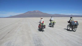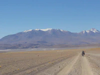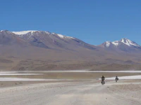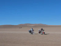 Pour parcourir la Bolivie, peu de routes s’offrent au voyageur. Nous avons choisi de passer par les routes de l’Ouest, et d’emprunter la fameuse Route des lagunes après notre sortie du Salar. Le défi sportif nous attire bien sûr, et cette route traverse un désert superbe, ponctué de lacs multicolores peuplés de flamants roses, d’étendues de sable et de cailloux, de volcans, de formes rocheuses… Le paysage promet d’être incroyable ! C’est une des seules routes dont nous rêvons depuis la préparation du voyage. Les conditions dans lesquelles nous partons sont idéales : il fait très beau et sec, ce qui signifie : pas de bouillasse dans les chemins ; nous avons un topo génialissime, très bien fait et détaillant les points d’eau et de ravitaillement ; et surtout, nous sommes toujours à quatre avec Rémi et Jennifer. Et rouler avec des amis permet de dédramatiser les situations compliquées, qui seront sûrement au rendez-vous, de se remonter le moral plus facilement, et surtout de bien se marrer ! Cela ne peut que bien se passer !