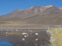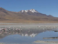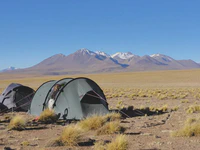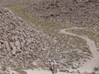 Ce troisième jour est très agréable. La piste est finalement en bien meilleur état qu’annoncé sur le topo. Nous avançons le long d’un chapelet de lacs aux couleurs sublimes : laguna Hedionda, laguna Chiar Khota, laguna Honda et enfin laguna Santa Cruz. La piste est vraiment bien roulable, le décor magnifique et les flamants roses au rendez-vous pour prendre la pose devant les appareils des touristes. Jusque-là, les occupants des 4x4 étaient vraiment sympas : on nous encourageait, on nous donnait de l’eau. Mais depuis aujourd’hui, c’est un peu désagréable, comme si les gens étaient en safari et que nous étions les animaux. Ils nous prennent en photo, sans demander l’autorisation, sans un mot gentil, parfois sans même nous dire bonjour. Ce n’est pas très agréable… Nous commençons notre ascension vers un nouveau col, à 4 700 mètres cette fois. Mais l’après-midi est trop court et nous installons le camp du jour quelques kilomètres avant le col, au milieu d’un décor de rêve et vraiment très loin de tout ! Le froid et le vent empêche de bien profiter de tout ça, mais c’est quand même un régal. Nous nous souvenons de toutes les photos que nous avions vu lors de la préparation, cette fois, ça y est, c’est notre tour !