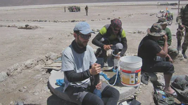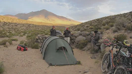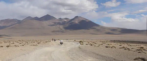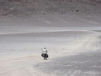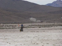 Au quatrième jour, les choses se compliquent. Le col est long à atteindre, la piste se détériore encore, et surtout le vent est pile de face. À ce stade, toute la végétation a disparu. À perte de vue, ce ne sont que cailloux, sable et poussière. Pas la moindre petite trace de vert. La piste n’est pas claire, on peine à être sûr que nous sommes dans la bonne direction. On souffre et le moral retombe pour tous dans les chaussettes. Même Olivier, qui est dur à décourager, peine. Rencontre amusante : alors que nous poussons nos vélos dans le sable (pour changer), nous croisons 2 polonais, dans le sens inverse, qui eux aussi… poussent évidemment ! C’est génial de réussir à rencontrer d’autres cyclos même au milieu de rien de rien ! Nous continuons la route, faisons une pause ravitaillement en eau dans un hôtel au milieu du désert, puis passons l’après-midi sur une route plus défoncée que jamais. Le vent n’arrête pas de souffler, ça aussi c’est épuisant. Le soir, nous sommes contents de pouvoir poser les tentes à l’abri de quelques rochers. La fatigue se fait sentir…